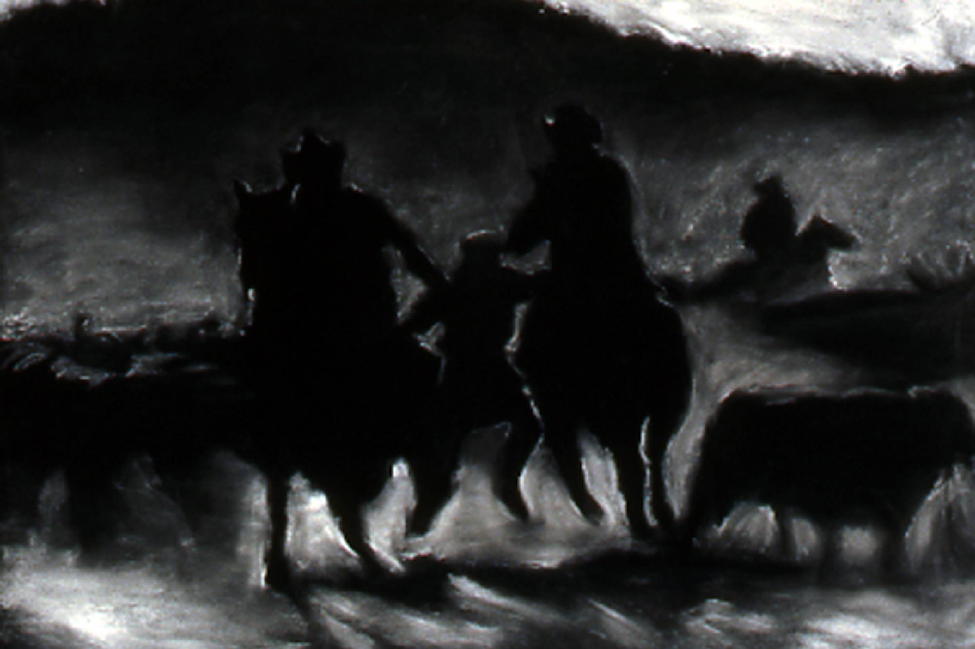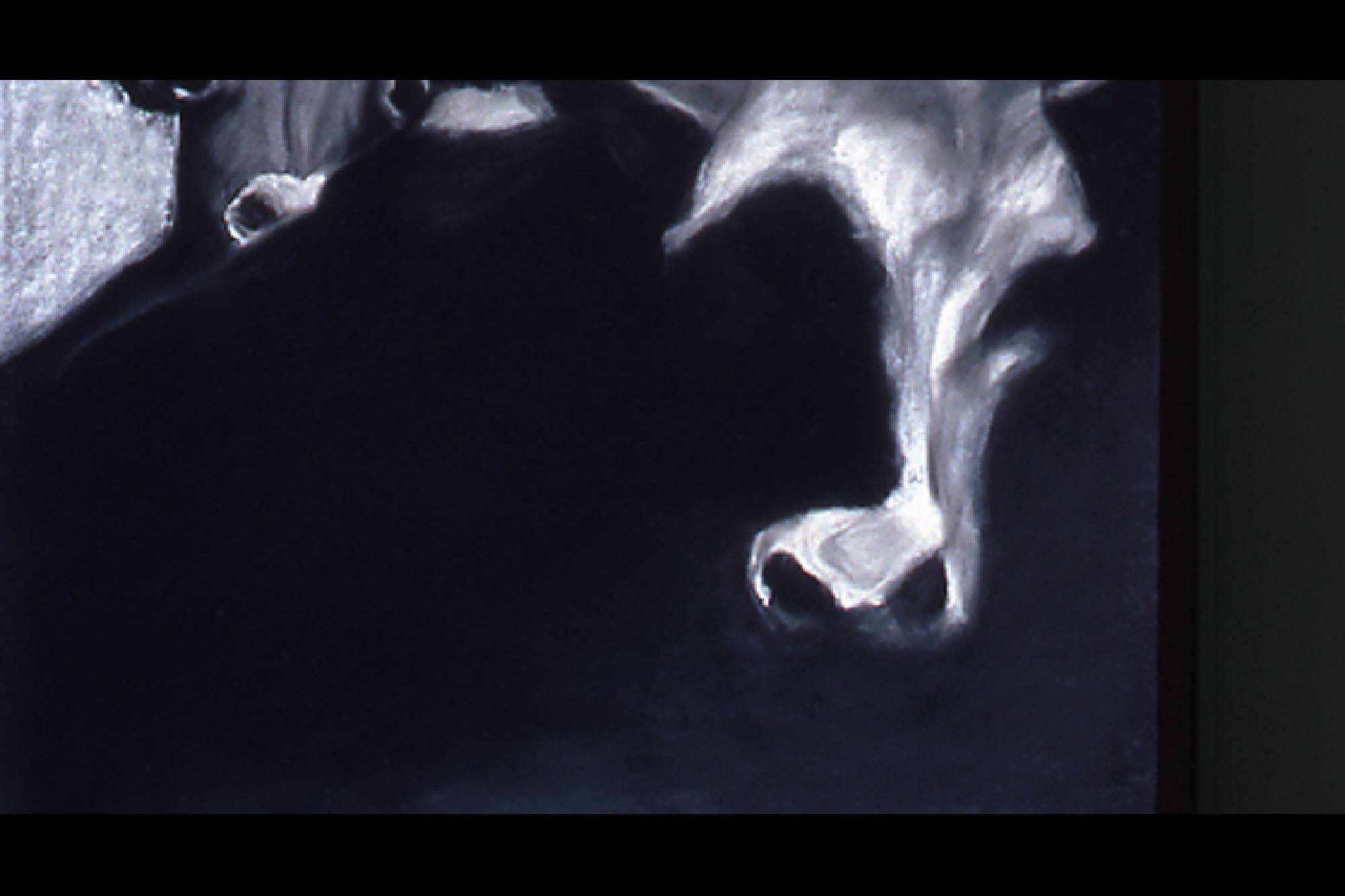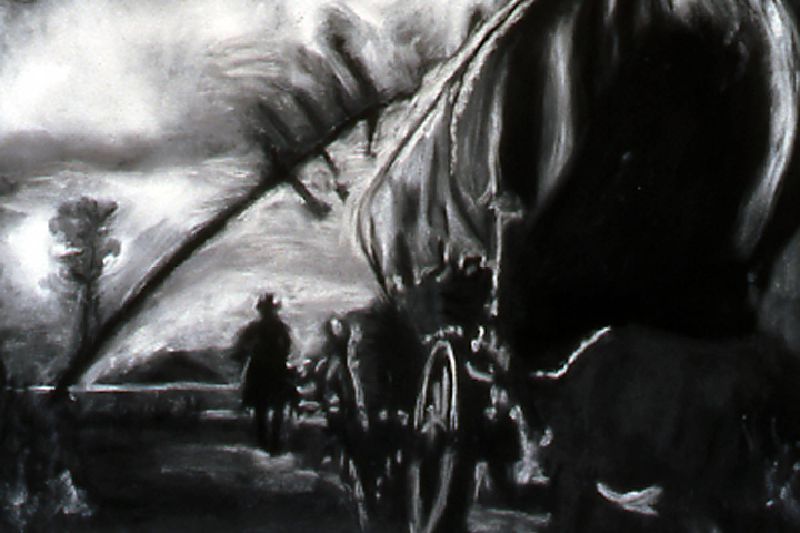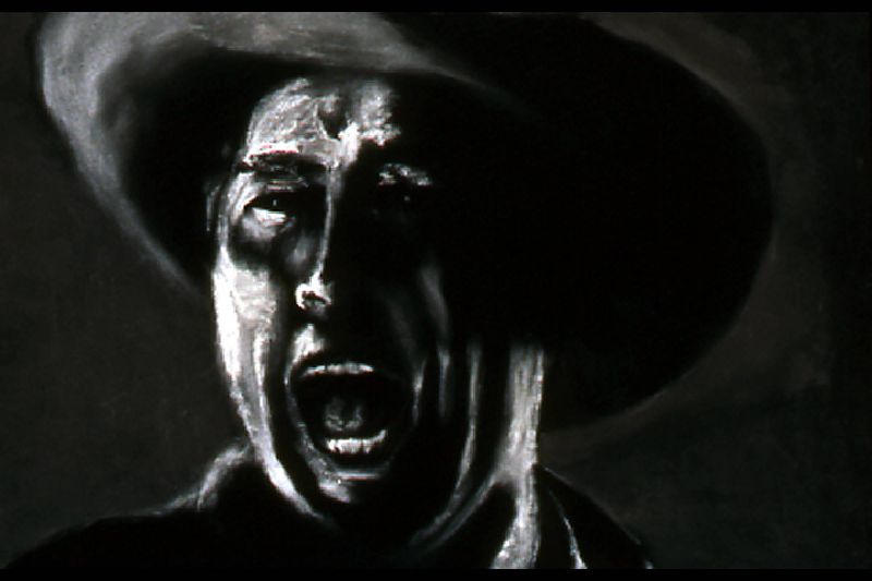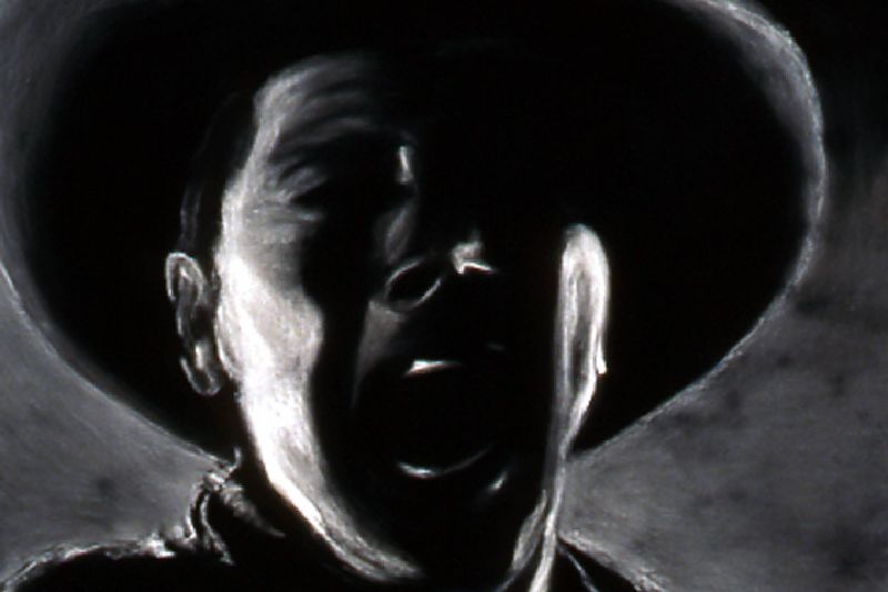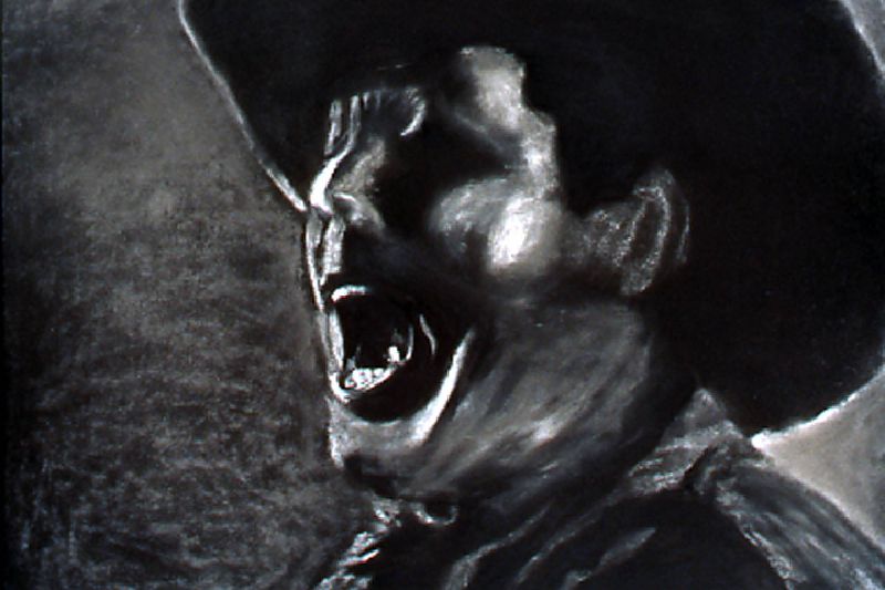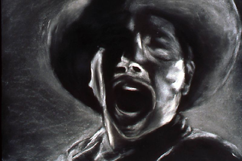The Range Series drawings, inspired by the cinematic climax of the film The Last Picture Show, revisits the death scene of cinema itself. Within the movie, The Last Picture Show, we are witness to the death of a small Texas town as symbolized by the closing of its movie house. In the theater’s final screening, we see a short scene from the movie, Red River, savored by the town’s few remaining residents. In it, cowboy's cattle call, like talking heads in extreme close-up, to start the long cattle drive in a movie about progress and movement, laid within a movie about decline and inertia. My drawings, like a movie still, are frames frozen in time, caught somewhere between ecstasy and agony. They act as artistic remnants of our own psychological ambivalence – we are the West, both projected hero and fallen icon. Somewhere between pleasure and pain, these images flicker forever in the psyche-- manifest as a shimmering, mirage-like myth in the cultural imaginary.
