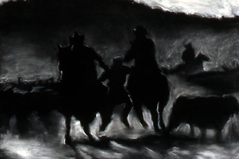The Range Series, inspired by the cinematic climax of the film The Last Picture Show, revisits the death scene of cinema itself. Within the movie, The Last Picture Show, we are witness to the death of a small Texas town as symbolized by the closing of its movie house. In the theater’s final screening, we see a short scene from the movie, Red River, savored by the town’s few remaining residents. In it, cowboy’s cattle call, like talking heads in extreme close-up, to start the long cattle drive in a movie about progress and movement, laid within a movie about decline and inertia. My drawings, like a movie still, are frames frozen in time, caught somewhere between ecstasy and agony. They act as artistic remnants of our own psychological ambivalence – we are the West, both projected hero and fallen icon. Somewhere between pleasure and pain, these images flicker forever in the psyche-- manifest as a shimmering, mirage-like myth in the cultural imaginary.