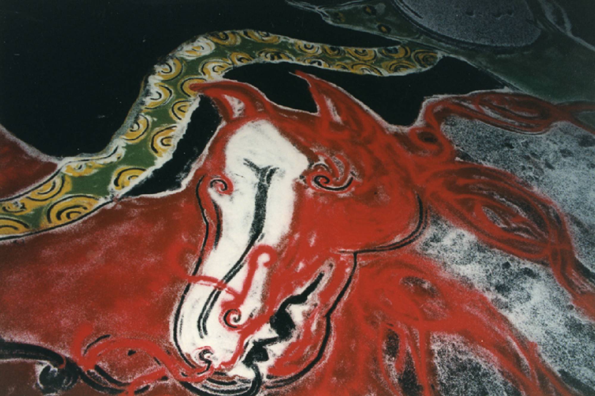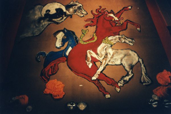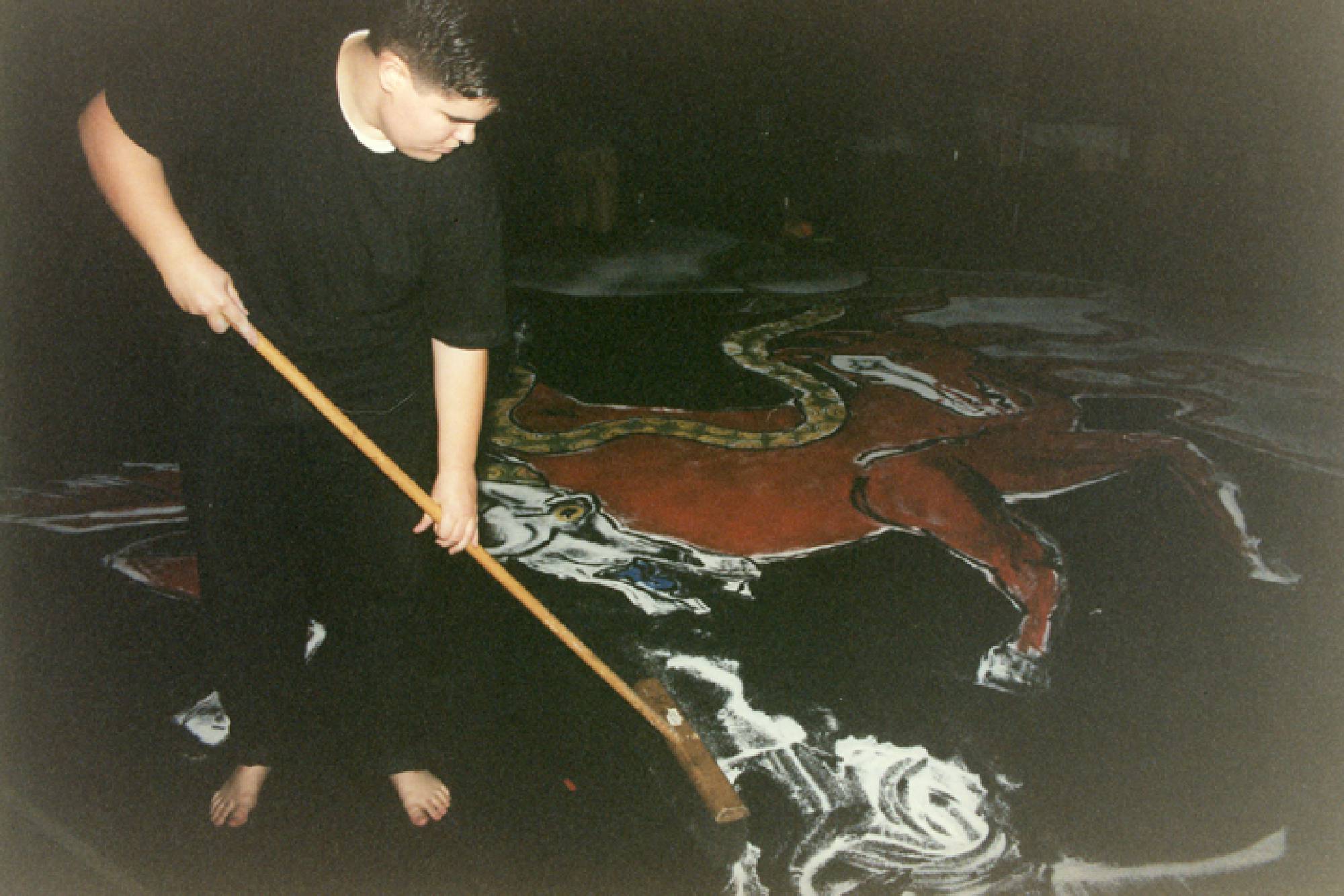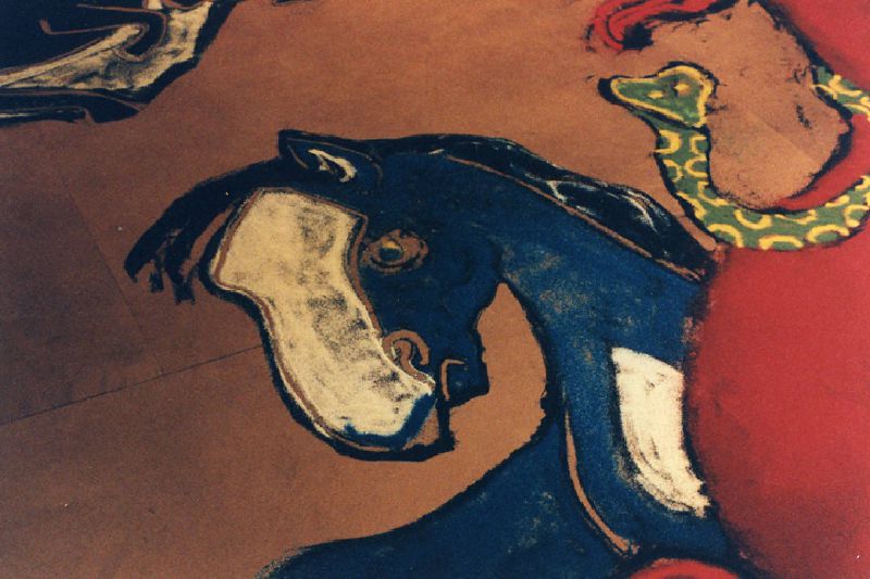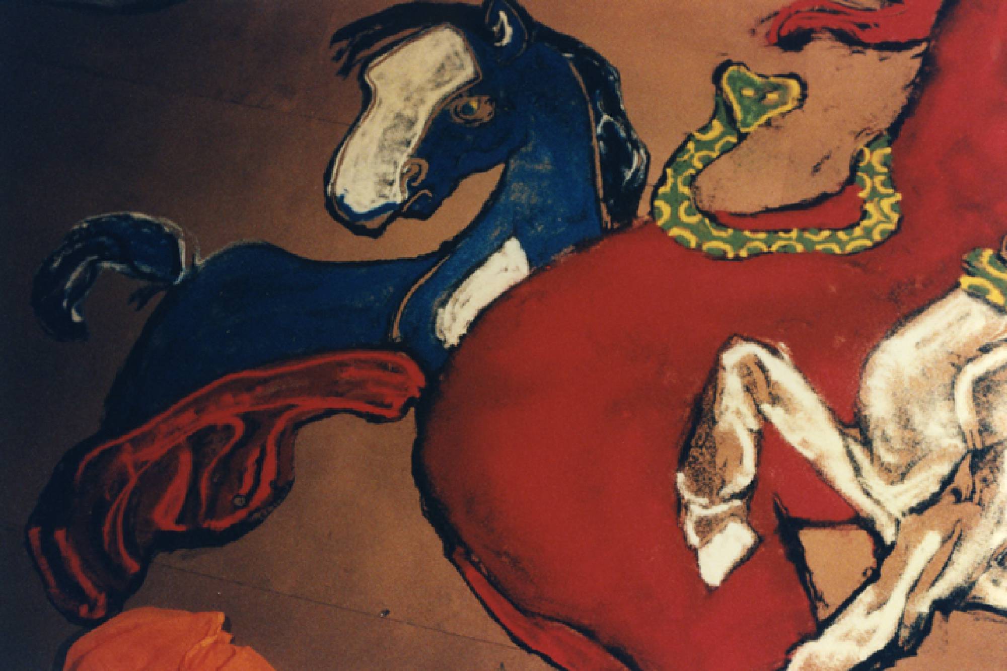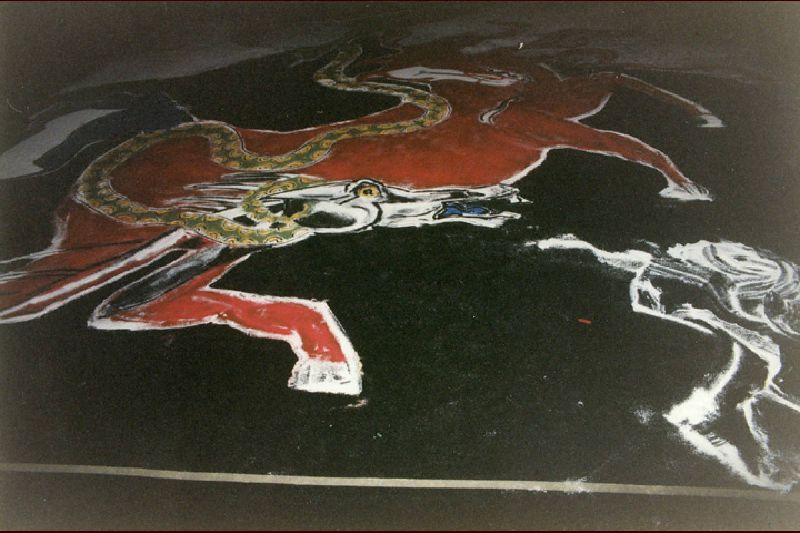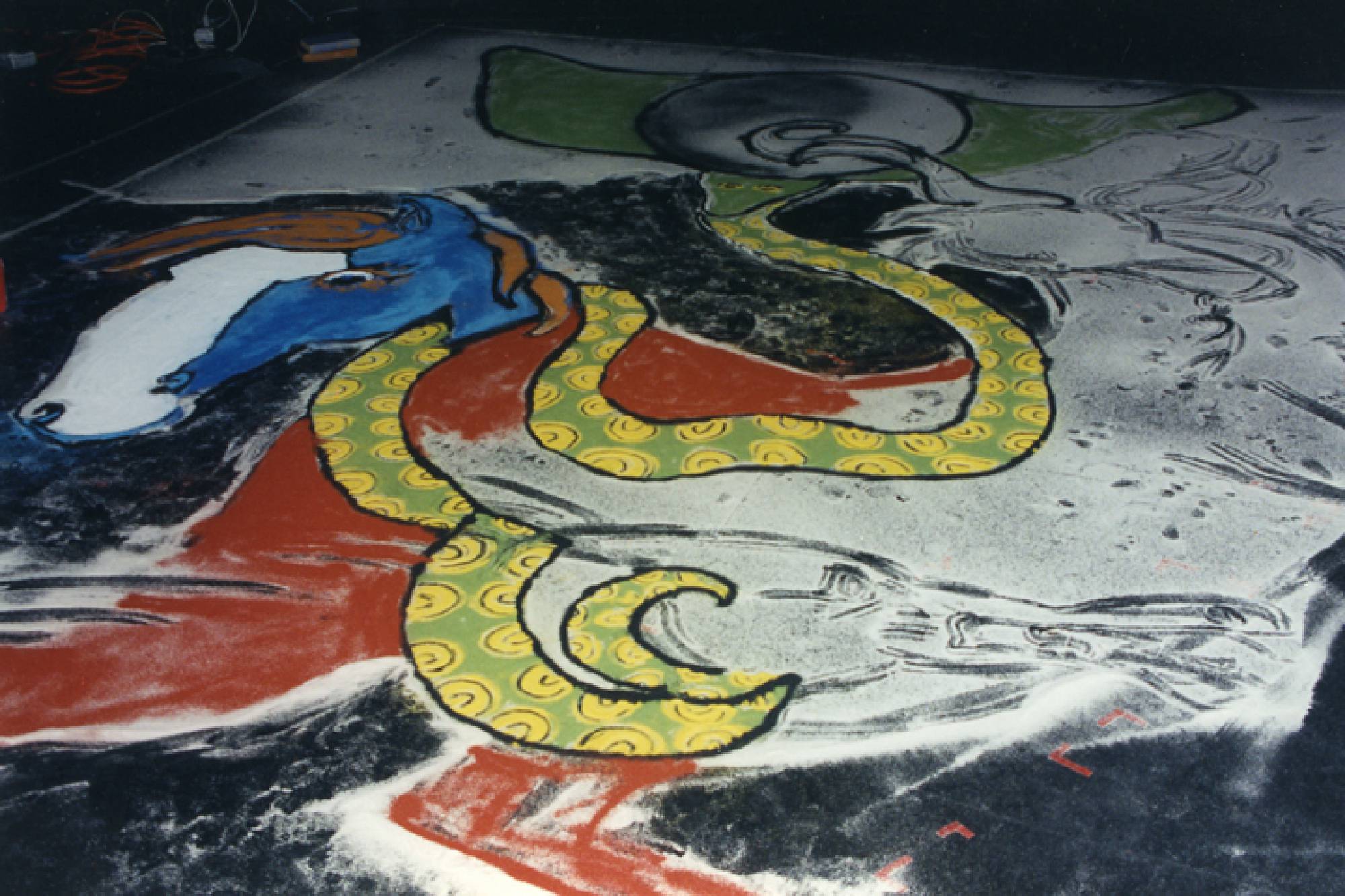RED HORSE premiered in New York with performances at the HERE Arts Center in 1996. The playing space was extremely limited, forcing Jenny to downsize the full-scale sand painting to accommodate a 10 x 15 foot stage. Distinct parts of the original design were abstracted creating one horse with elements of all three previous manifestations—the red Kali demon in the South Indian, kolam-style of the Pullivar community, the blue horse in homage to Thomas Gainsborough’s “The Blue Boy” and Gainsborough, the thoroughbred race horse of the same name, and lastly, the white stallion under attack, (here by a boa constrictor), in the style of the great animal painter George Stubbs, best known for his paintings of horses.
