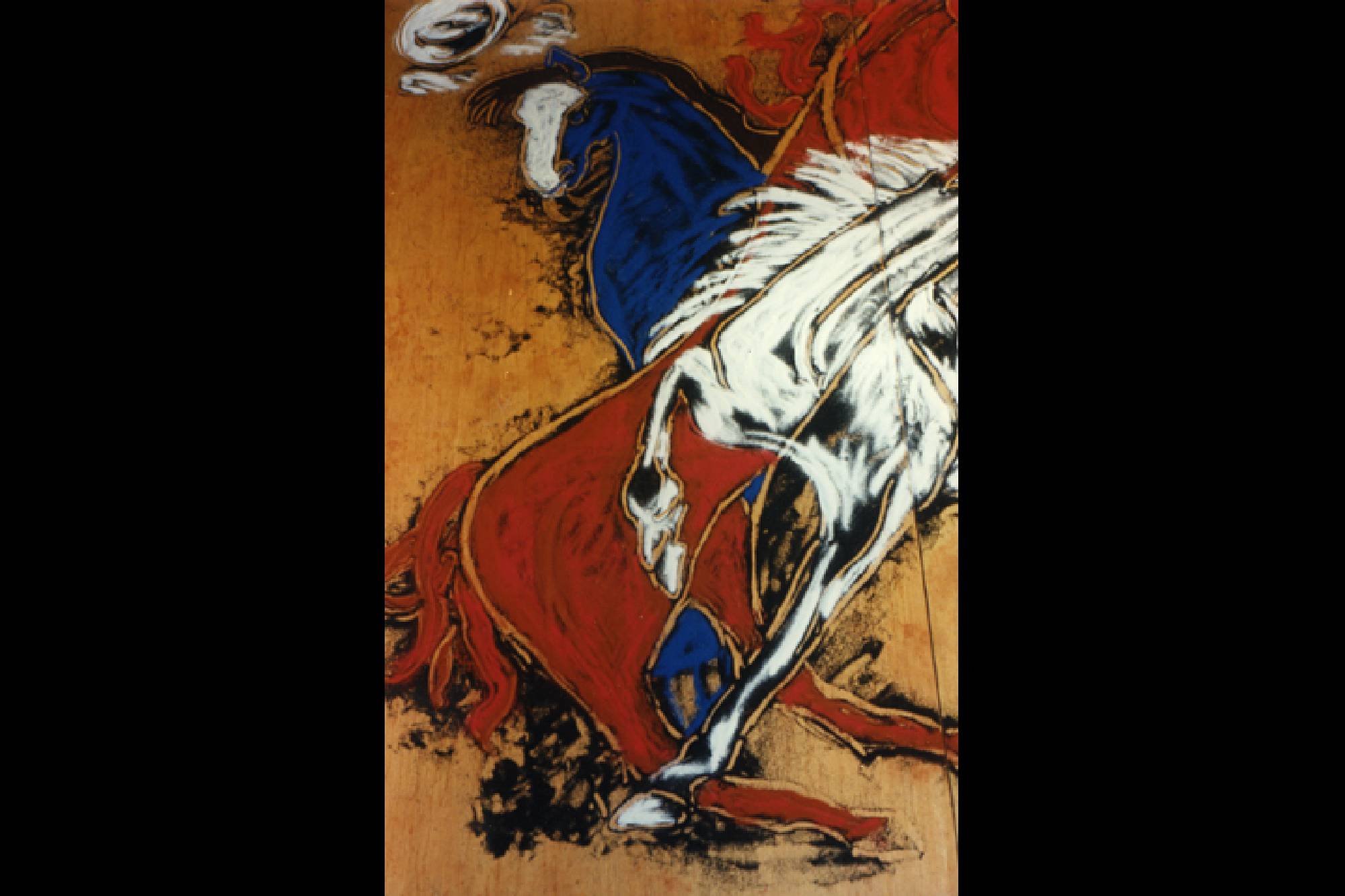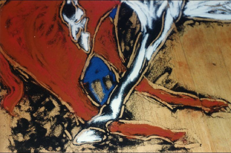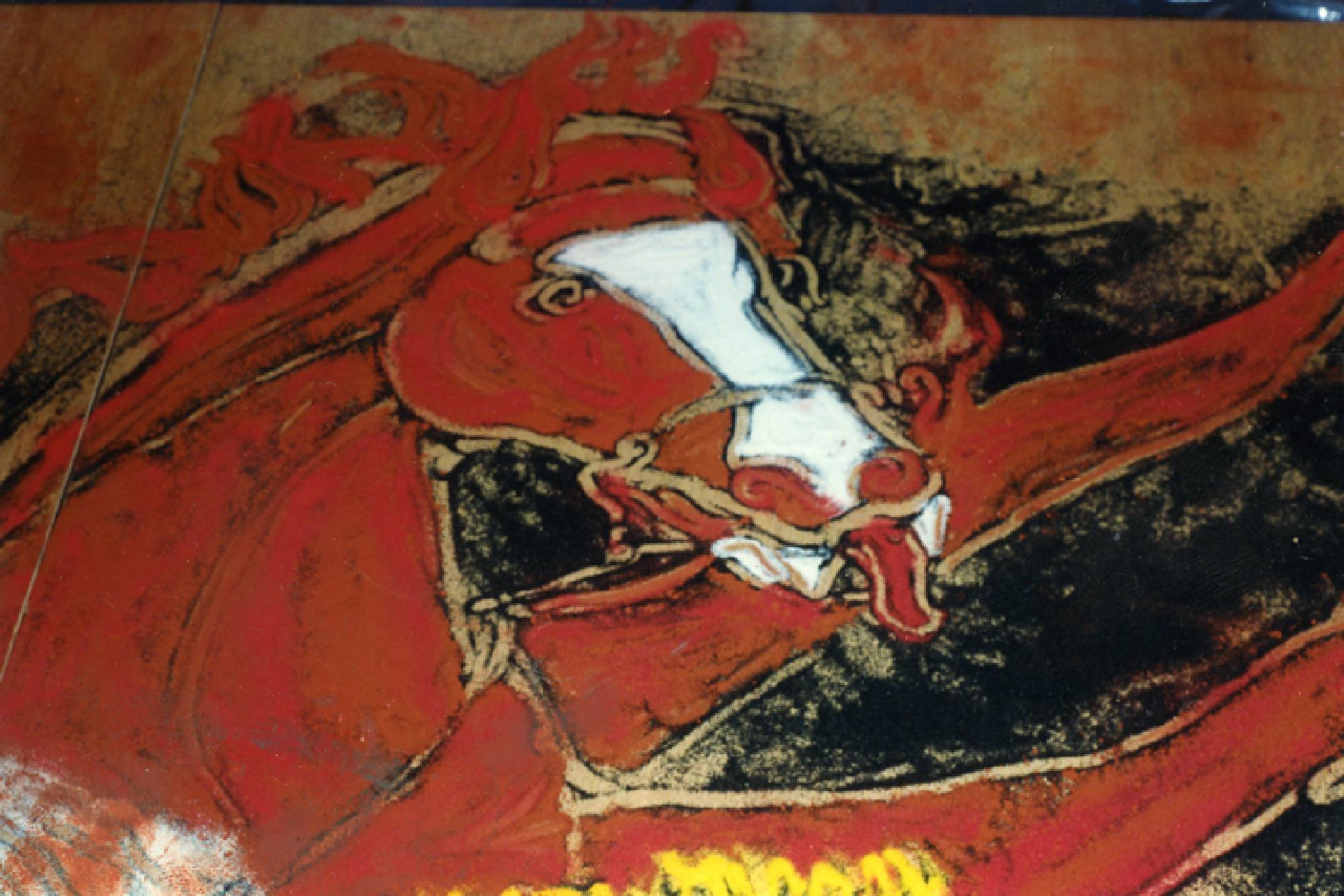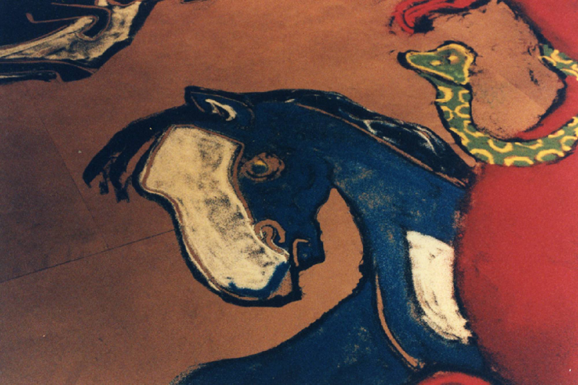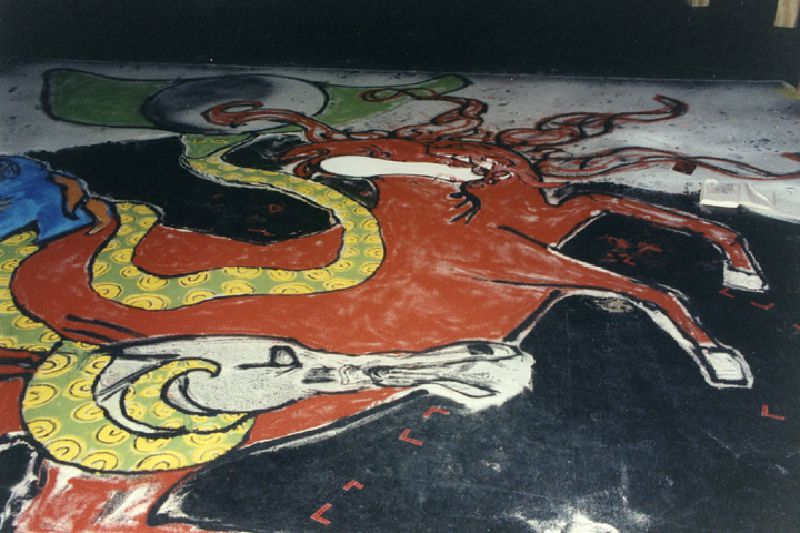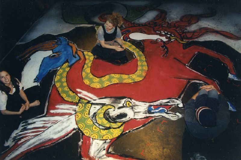RED HORSE premiered in New York with performances at the HERE Arts Center in 1996. The playing space was extremely limited, forcing Jenny to downsize the full-scale sand painting to accommodate a 10 x 15 foot stage. Distinct parts of the original design were abstracted creating one horse with elements of all three previous manifestations—the red Kali demon in the South Indian, kolam-style of the Pullivar community, the blue horse in homage to Thomas Gainsborough’s “The Blue Boy” and Gainsborough, the thoroughbred race horse of the same name, and lastly, the white stallion under attack, (here by a boa constrictor), in the style of the great animal painter George Stubbs, best known for his paintings of horses.