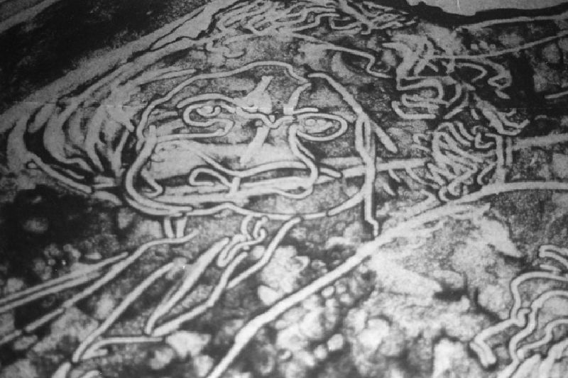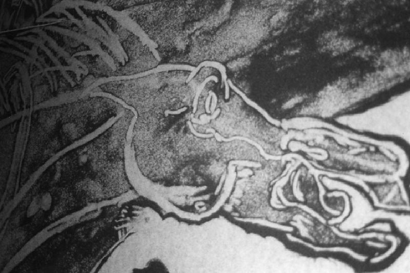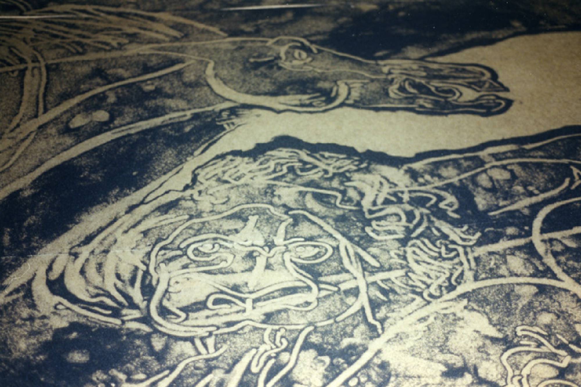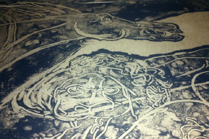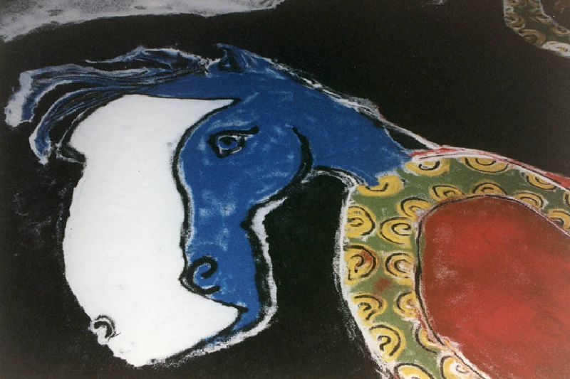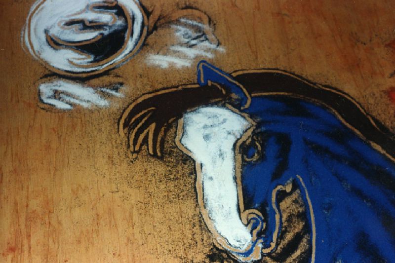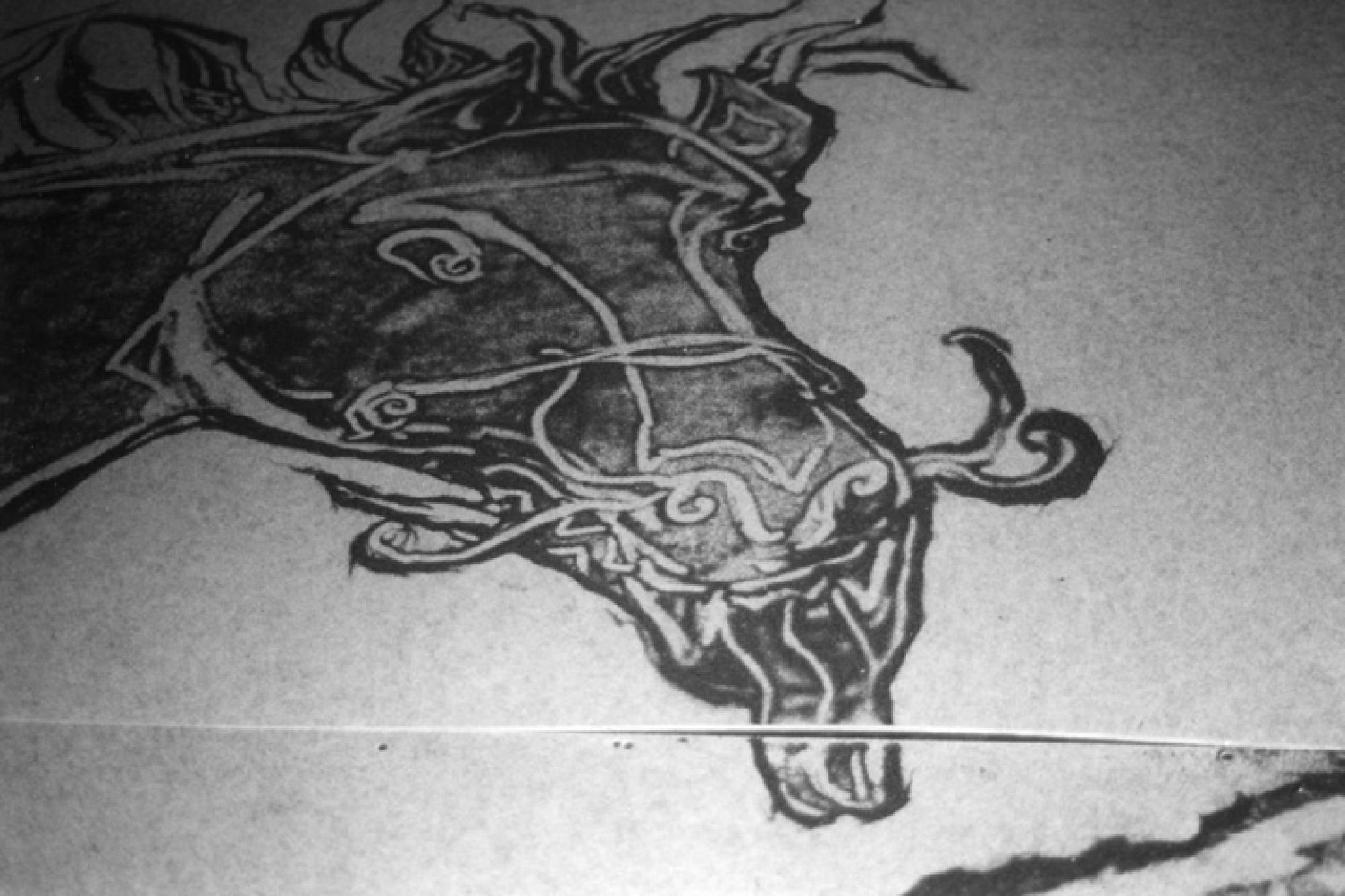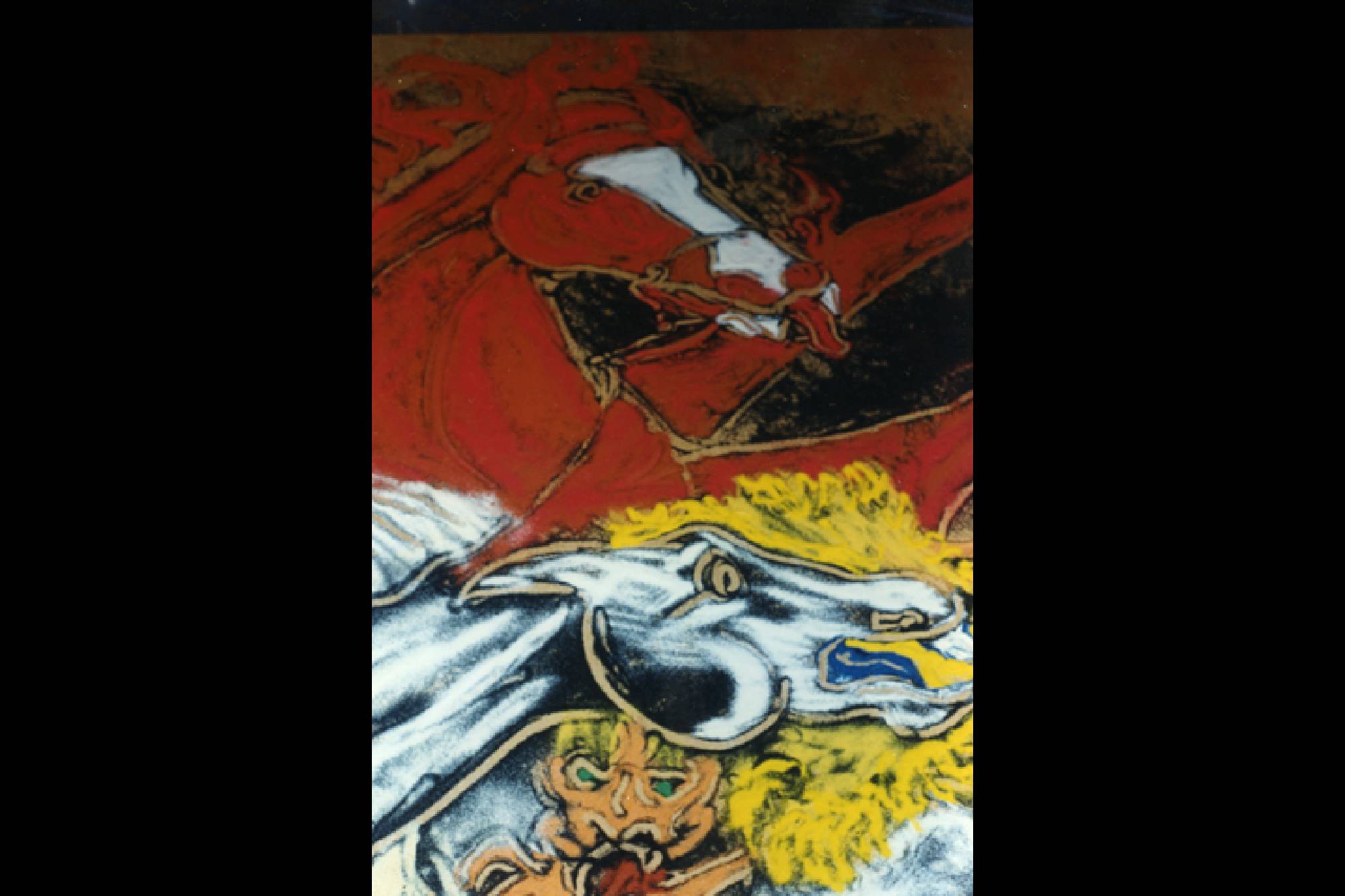 RED HORSE premiered in New York with performances at the HERE Arts Center in 1996. The playing space was extremely limited, forcing Jenny to downsize the full-scale sand painting to accommodate a 10 x 15 foot stage. Distinct parts of the original design were abstracted creating one horse with elements of all three previous manifestations—the red Kali demon in the South Indian, kolam-style of the Pullivar community, the blue horse in homage to Thomas Gainsborough’s “The Blue Boy” and Gainsborough, the thoroughbred race horse of the same name, and lastly, the white stallion under attack, (here by a boa constrictor), in the style of the great animal painter George Stubbs, best known for his paintings of horses.