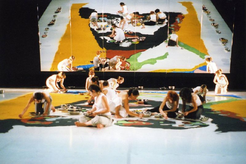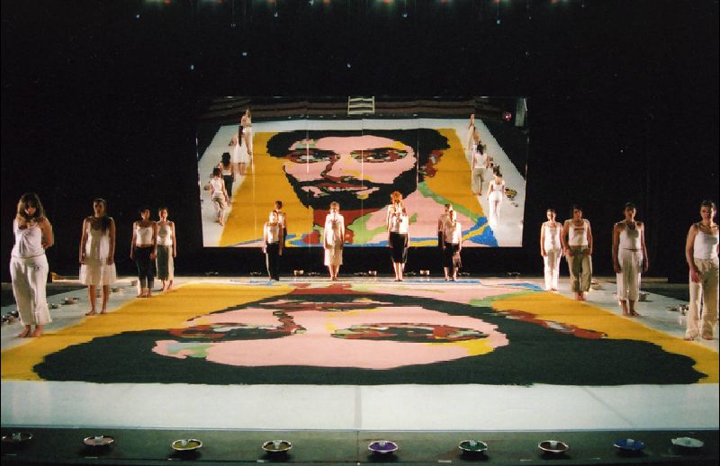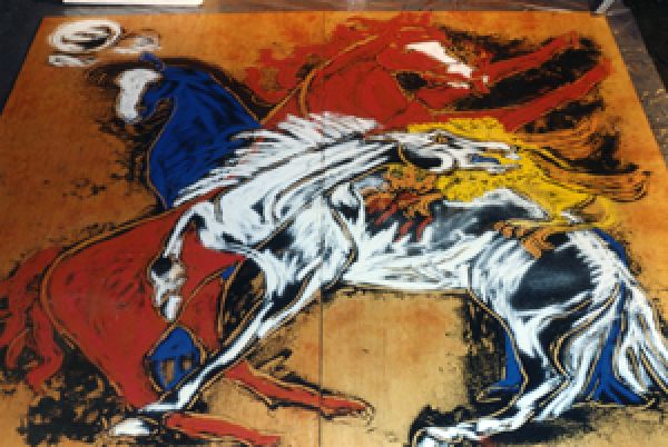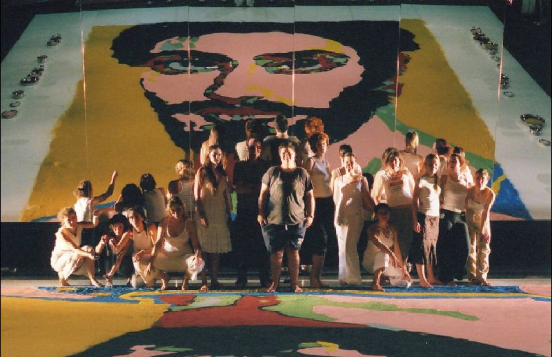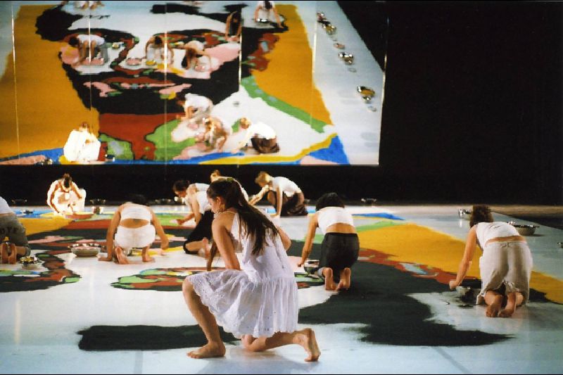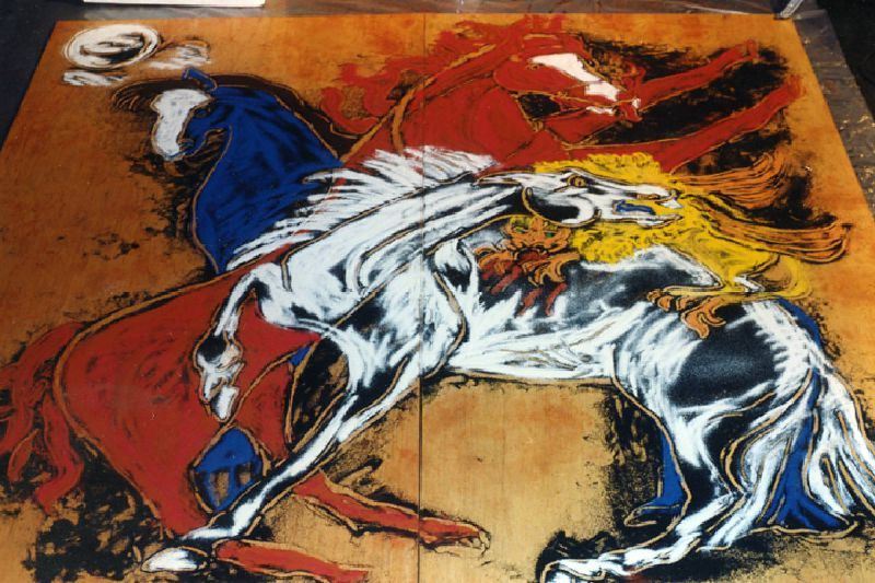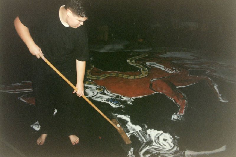 The international tour of the RED HORSE included the Rio Cena Contemporanea Theater Festival in Rio de Janiero, Brazil in 1996. This international theater festival takes place throughout Rio in warehouses, train stations, movie theaters, museums, cultural centers, theaters, cabarets, squares, streets, swimming pools, unusual spaces, in multiple forms as spectacles, performances, debates, seminars, shows, and urban interventions. The sand painting for the Brazilian tour of RED HORSE was 25 x 25 feet and took Ms. Rogers 10 hours each day to complete.