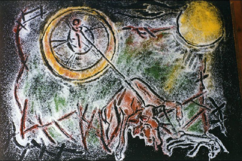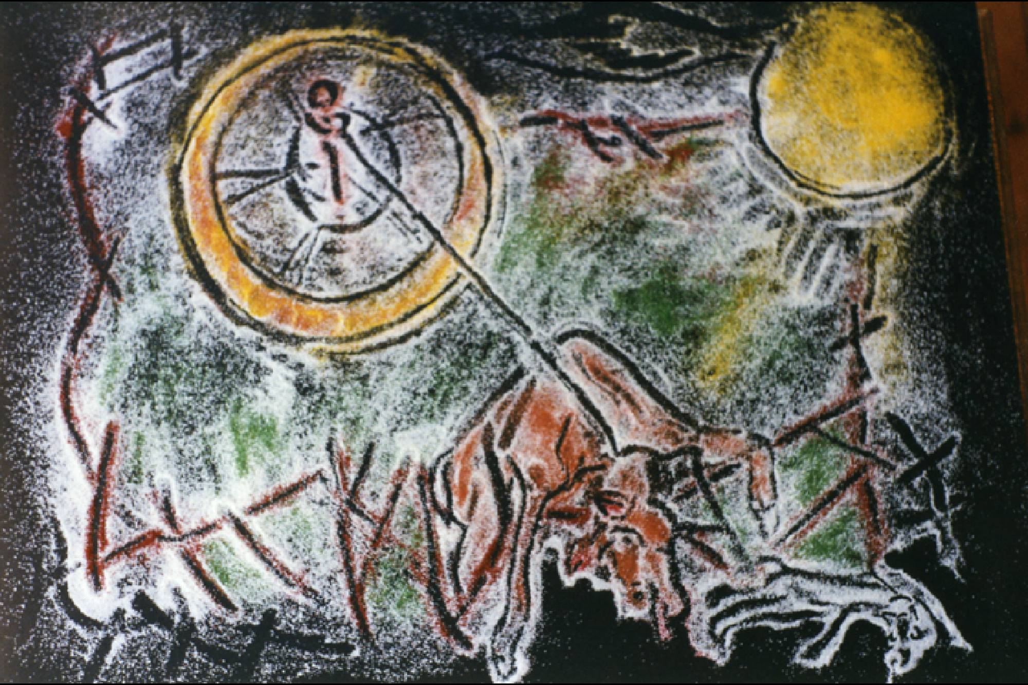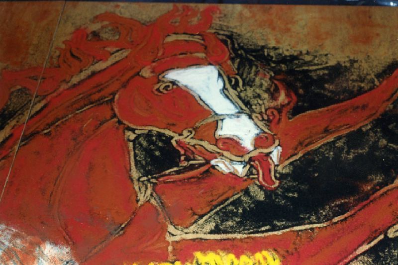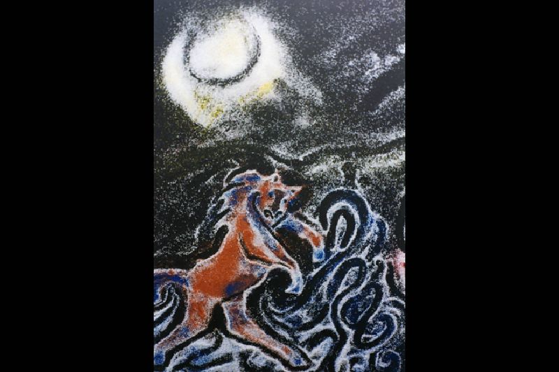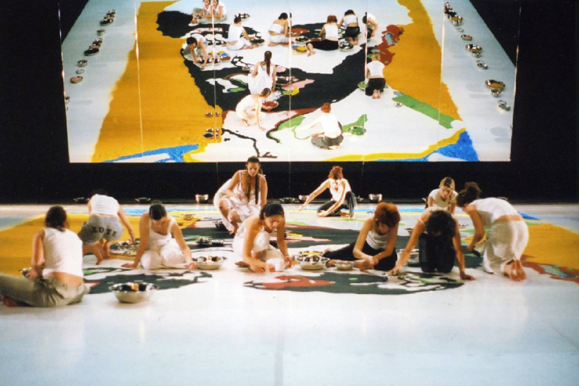 The international tour of the RED HORSE included the Rio Cena Contemporanea Theater Festival in Rio de Janiero, Brazil in 1996. This international theater festival takes place throughout Rio in warehouses, train stations, movie theaters, museums, cultural centers, theaters, cabarets, squares, streets, swimming pools, unusual spaces, in multiple forms as spectacles, performances, debates, seminars, shows, and urban interventions. The sand painting for the Brazilian tour of RED HORSE was 25 x 25 feet and took Ms. Rogers 10 hours each day to complete.