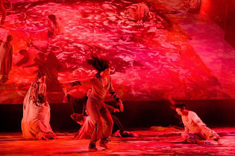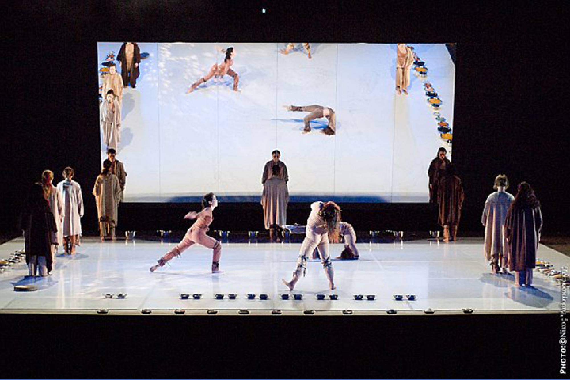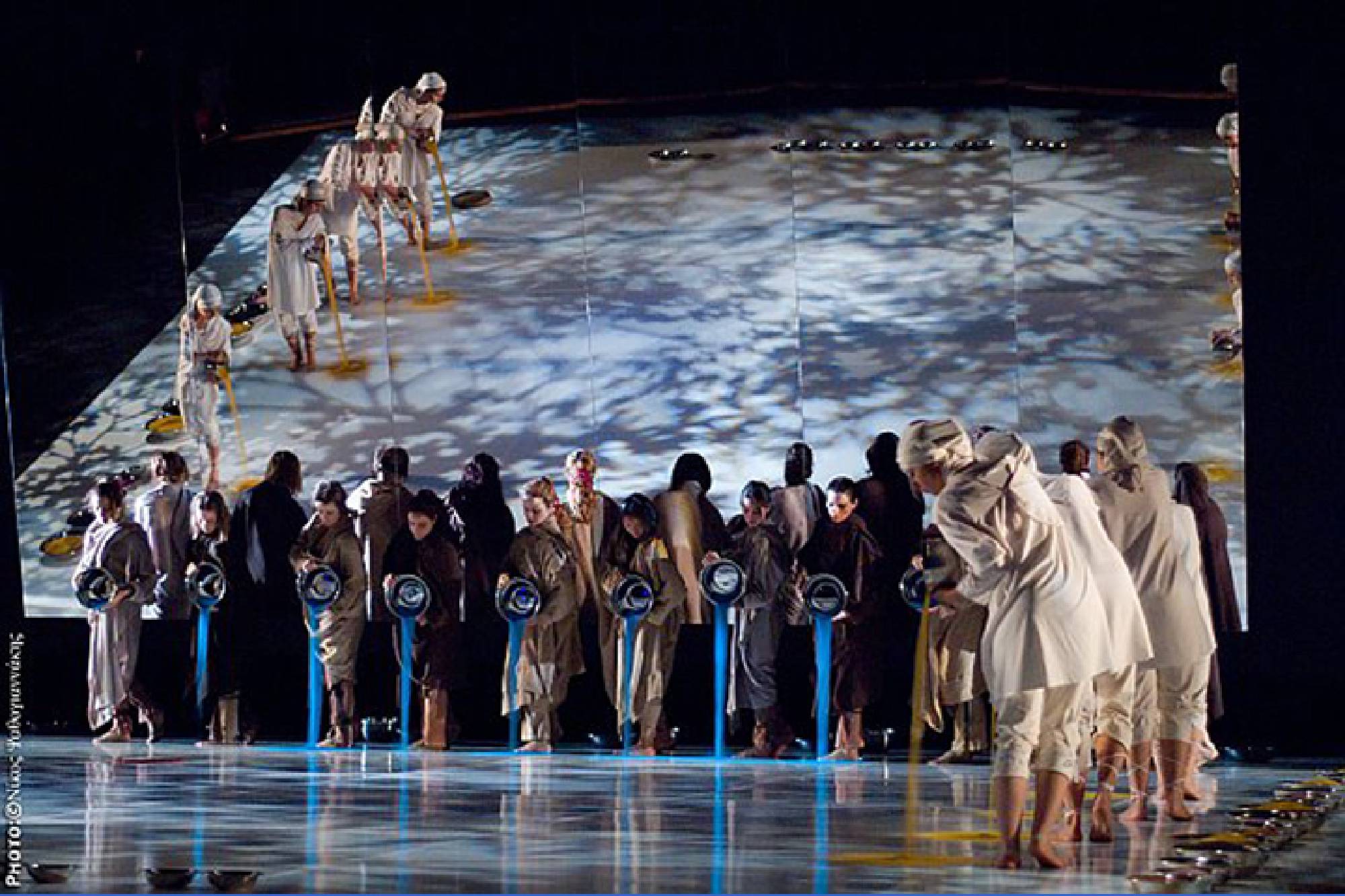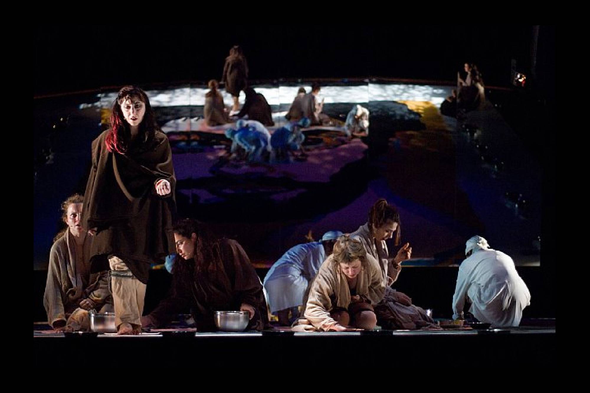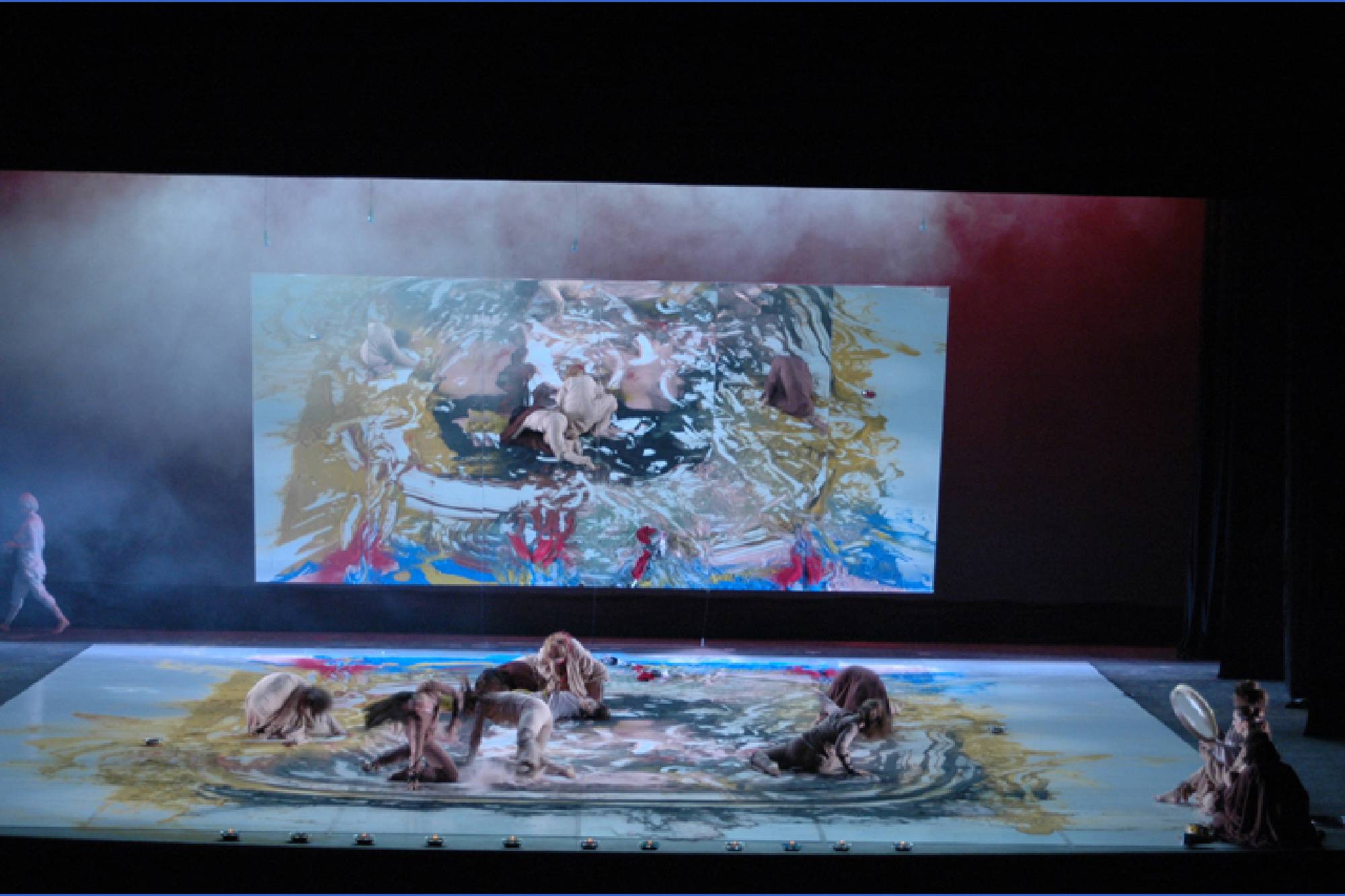 In CHOEPHORAE, the funeral act of pouring libations, historically enacted by slaves forced into ritual mourning for their master, is recast as a ritual act of art making, completed in real time in order to raise the spirit of the dead King. The painting, a collaboration between Ms. Rogers and a female team of 12 Greek visual artists*, was recreated each night during the play’s first act by the Greek painters in performance and then systematically destroyed by the Greek actors throughout the play’s second act.