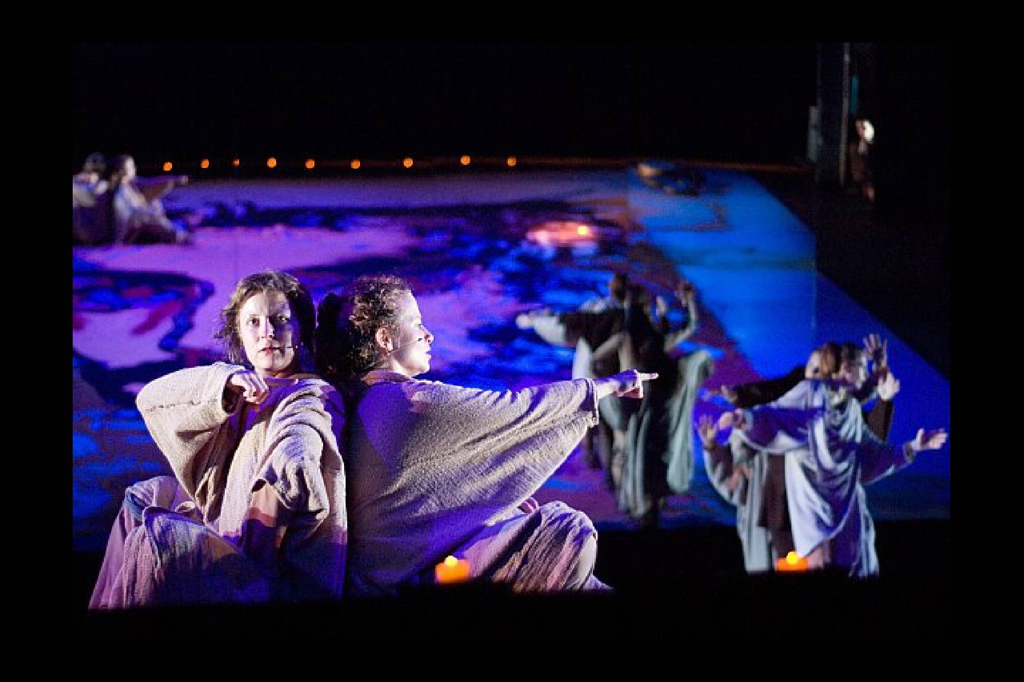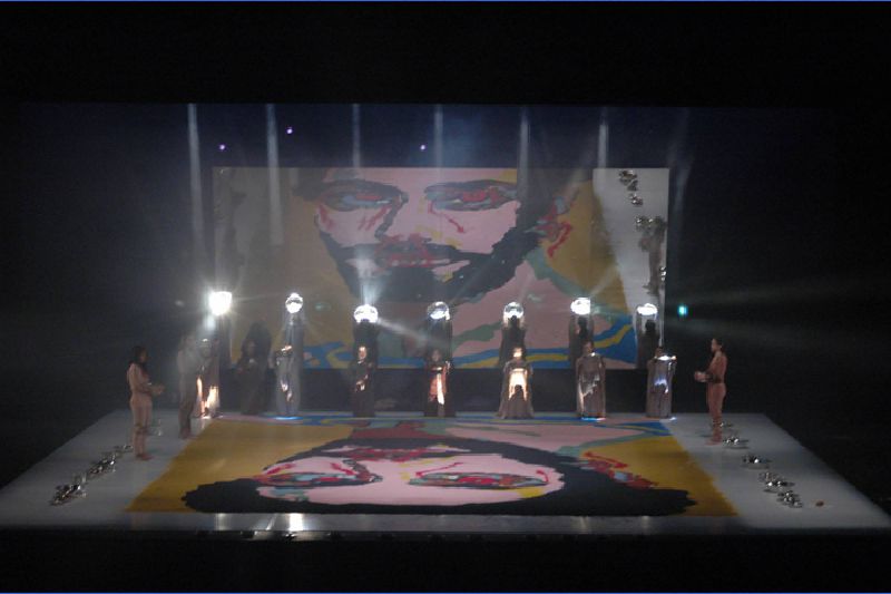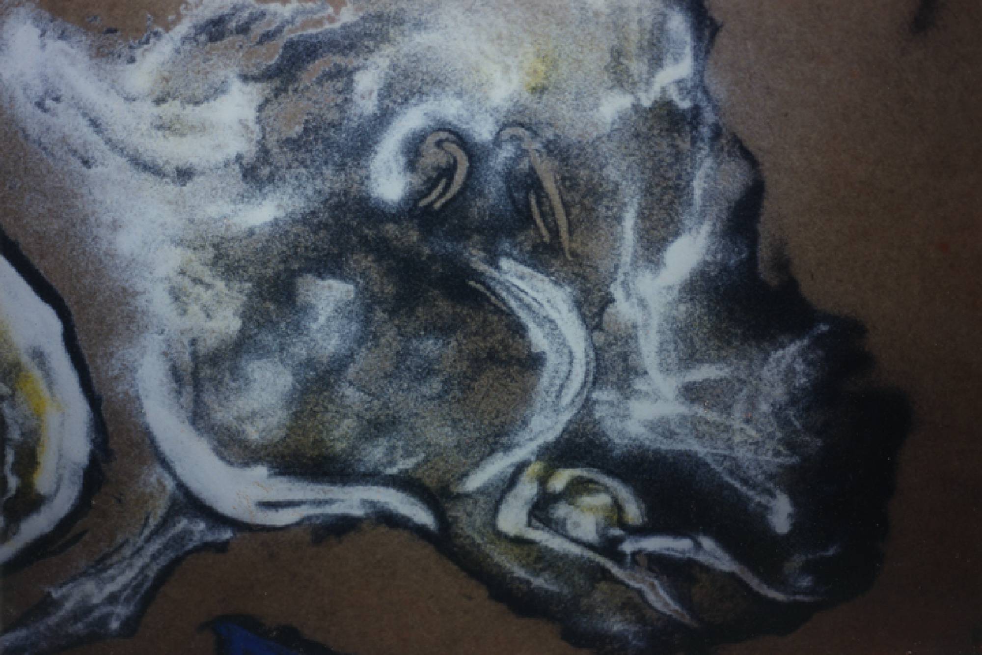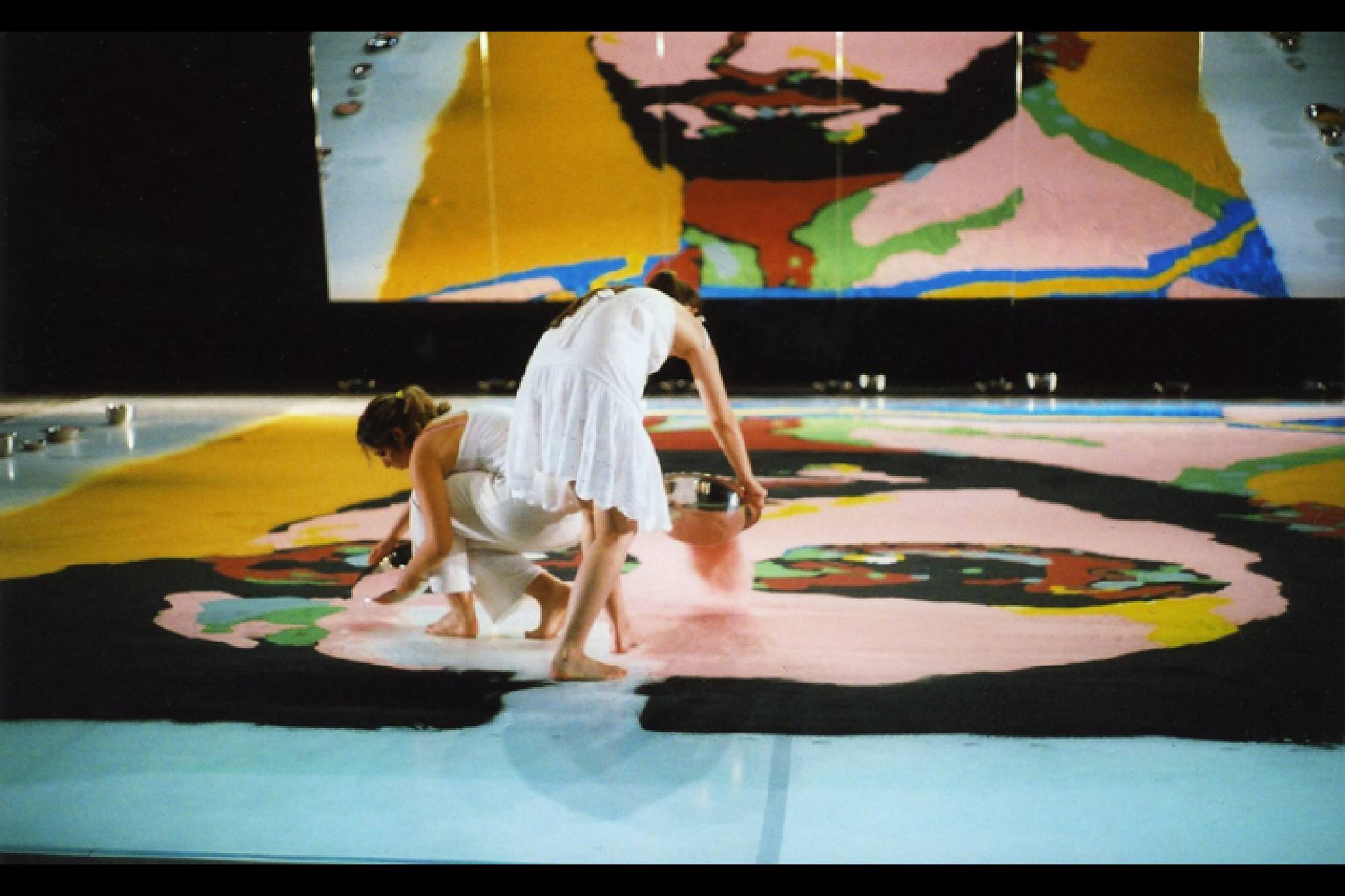 In CHOEPHORAE, the funeral act of pouring libations, historically enacted by slaves, or holferes, (which literally means slave or earth in Ancient Greek) forced into ritual mourning for their master, is recast as a ritual act of art making. Completed in real time, the pouring of libation, here the pouring of sand, culminates in the creation of a portrait of Agamemnon, a vision called forth in order to raise the spirit of the dead King.