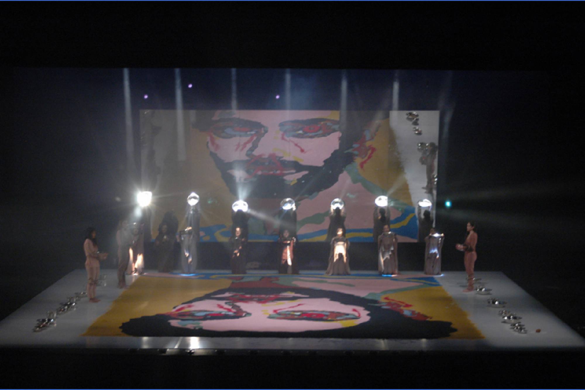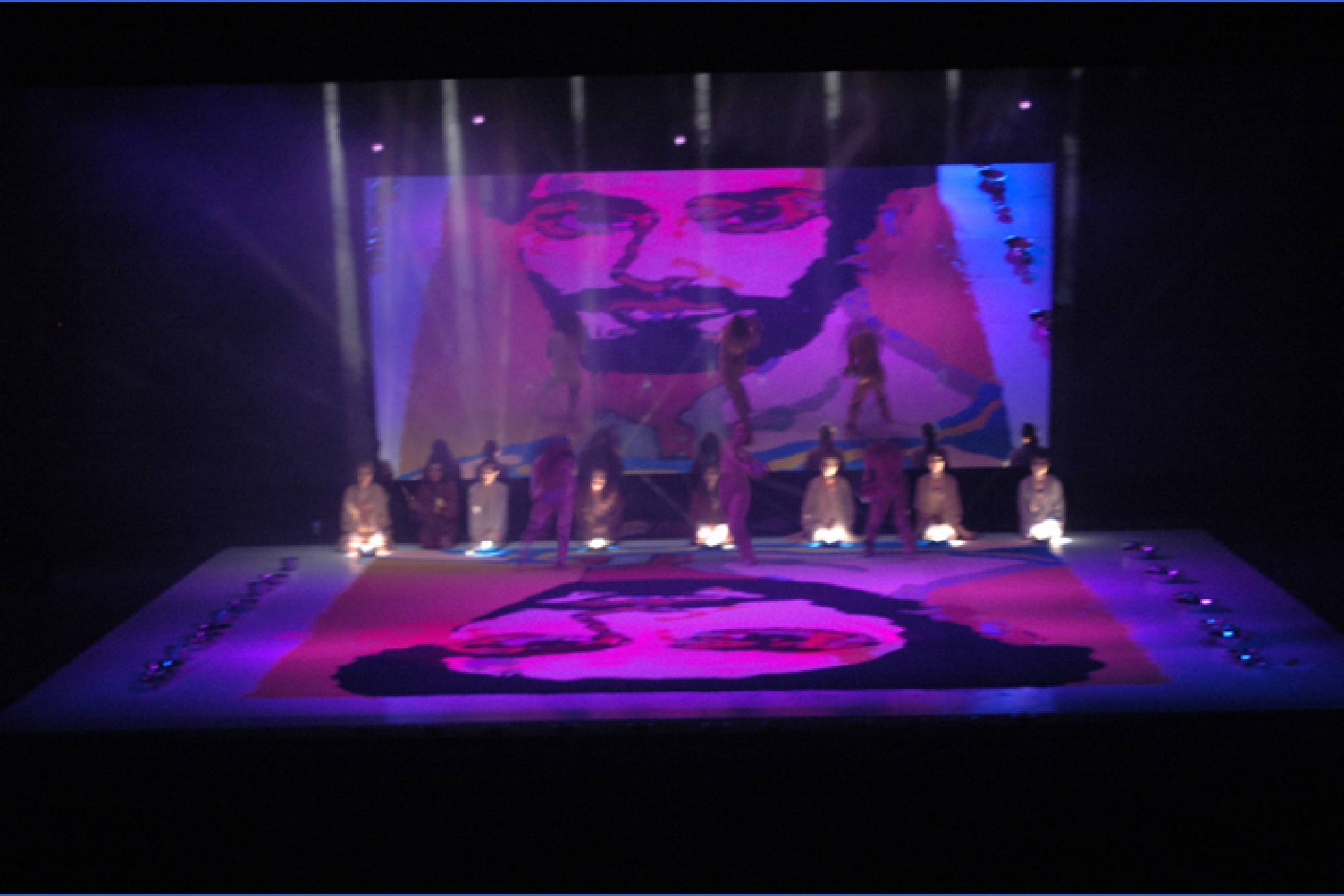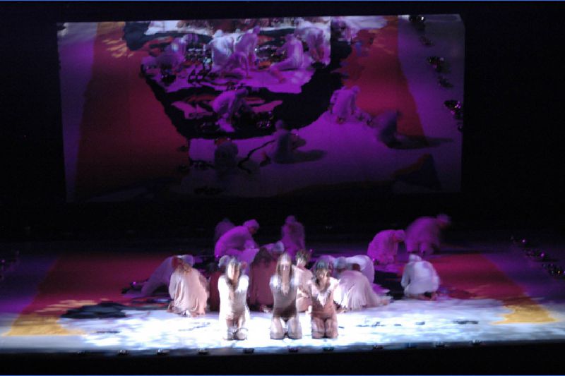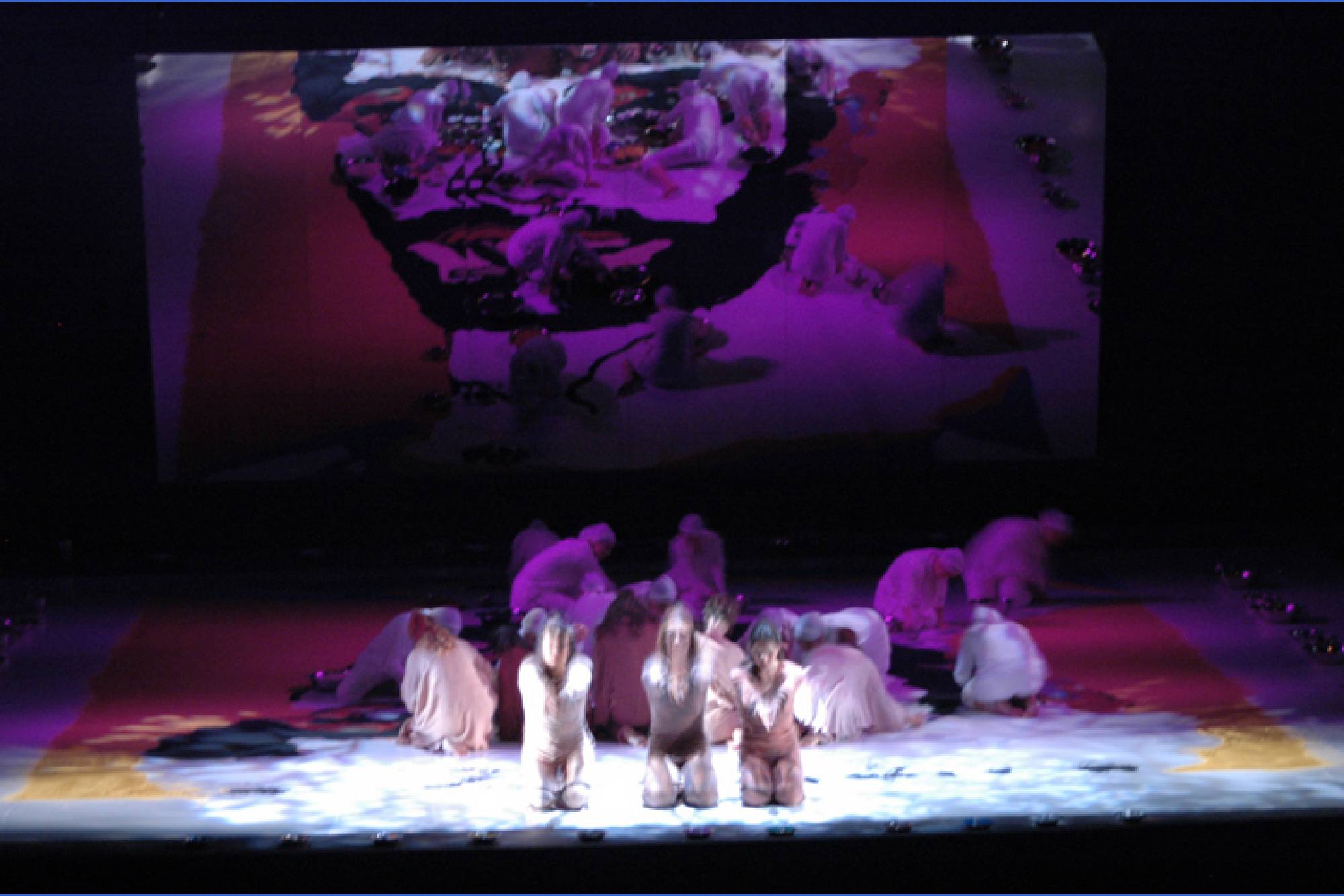 Commissioned as the set designer for the all female production, Ms. Rogers’ design required 700 lbs of sand per performance to complete a sand painting which filled the entire stage --32 ft x 24 ft . In addition, her set design included 6 mirrors, (each 12 ft x 4 ft), hung together as one huge mirror at the back of the stage so the painting could be viewed from two planes.