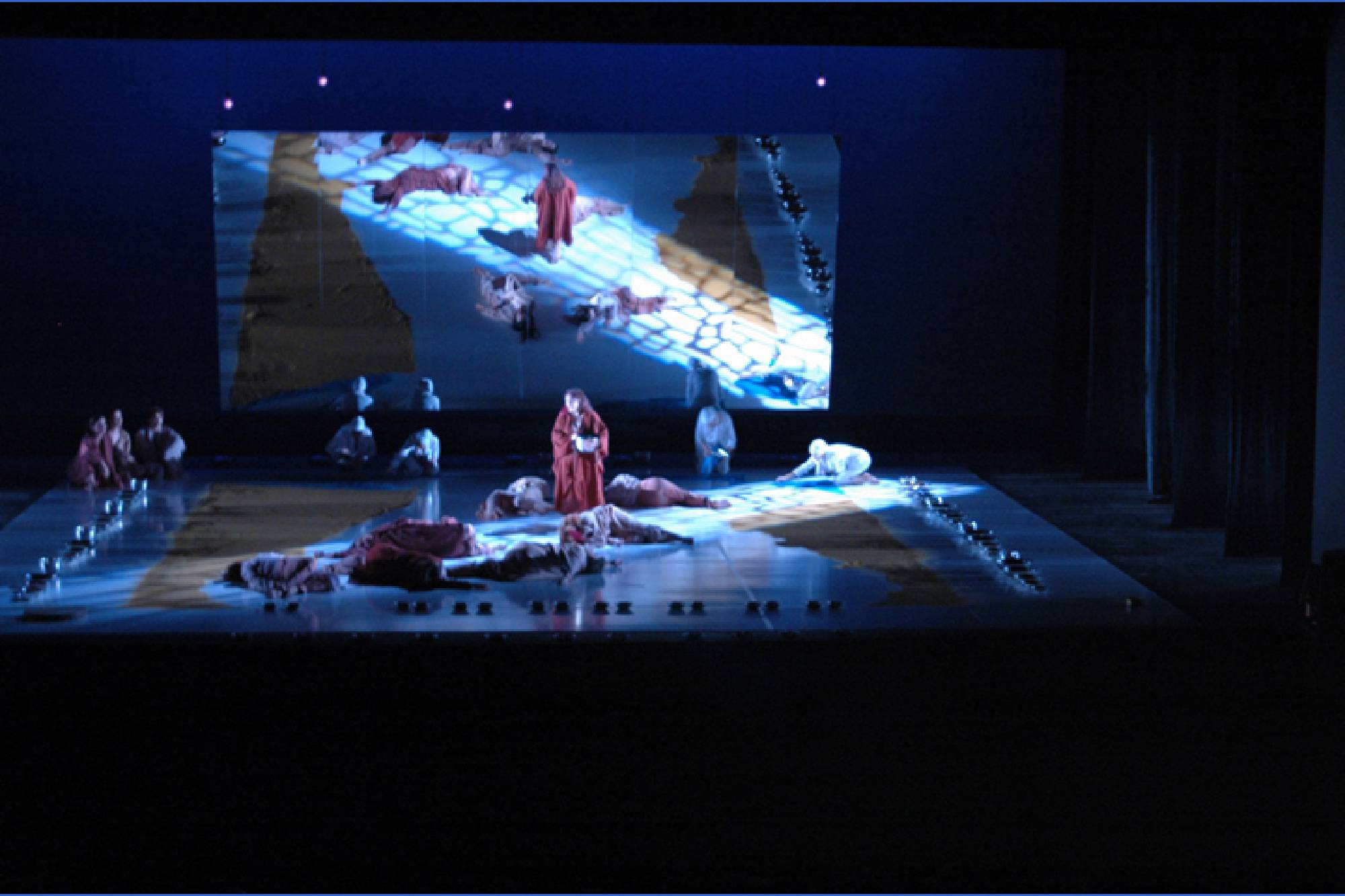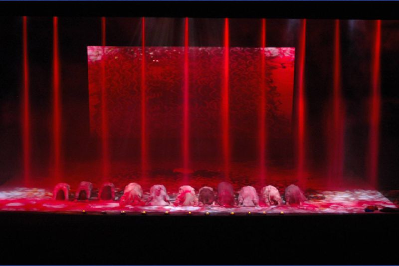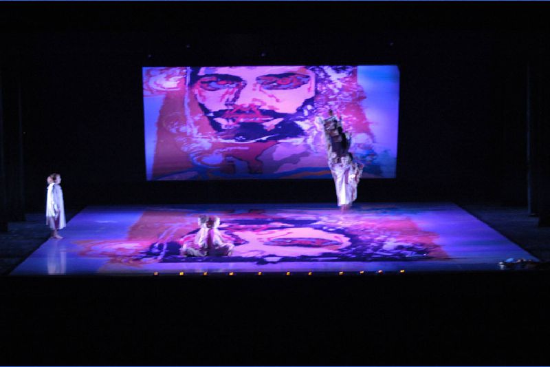 Commissioned as the set designer for the all female production, Ms. Rogers’ design incorporated a sand painting which filled the entire stage at 32 ft x 24 ft and required 700 lbs of sand per performance to complete. In addition, her set design included 6 mirrors, each 12 ft x 4 ft, hung together as one huge mirror at the back of the stage so the painting could be viewed from two planes.