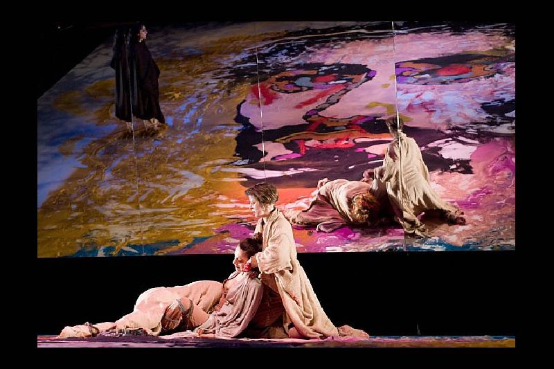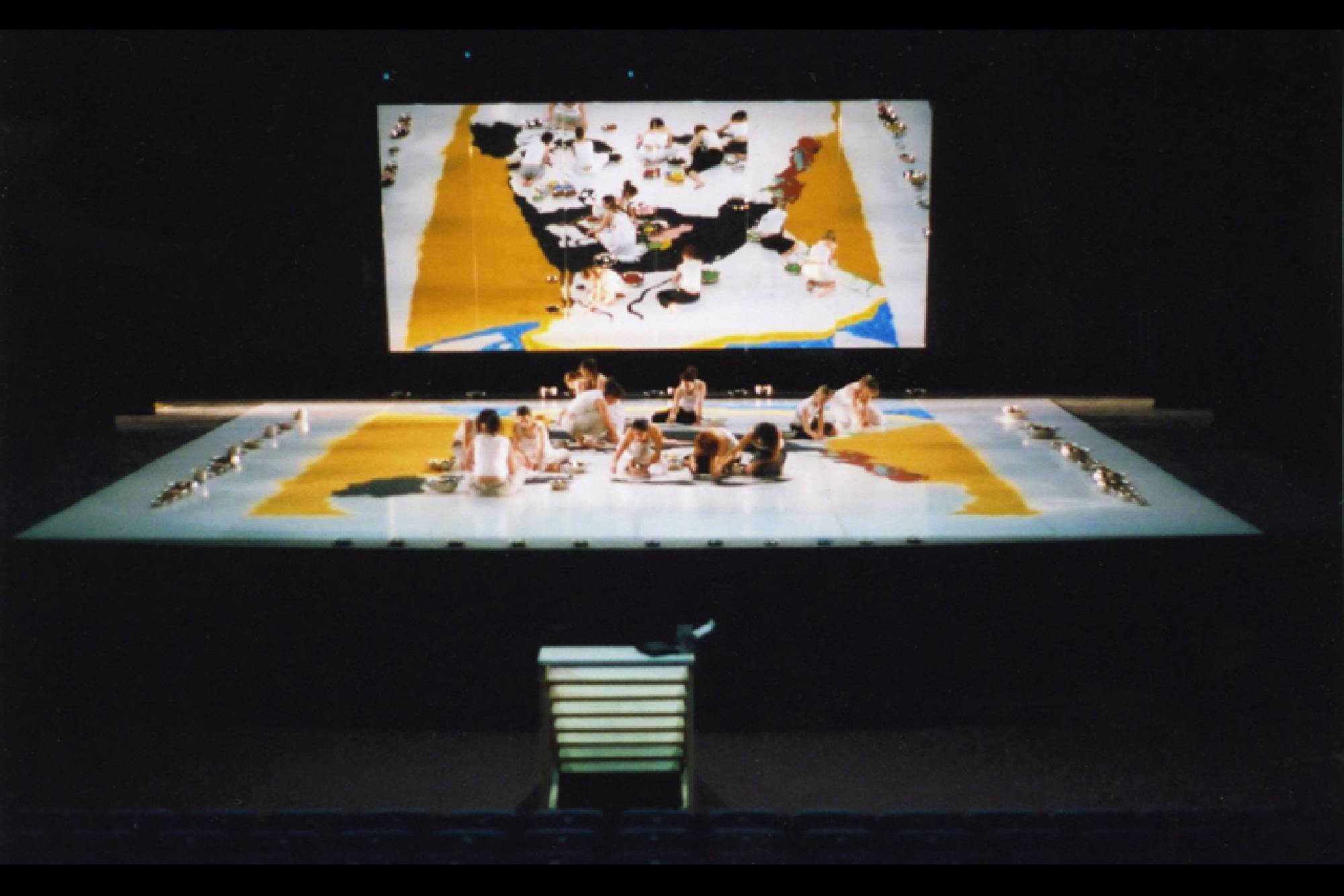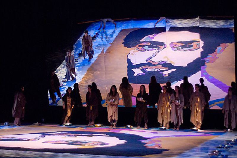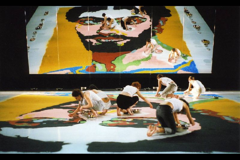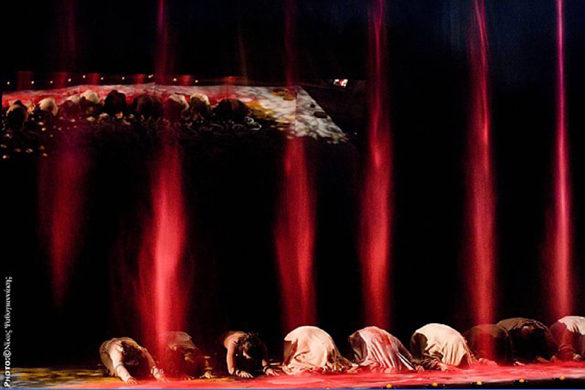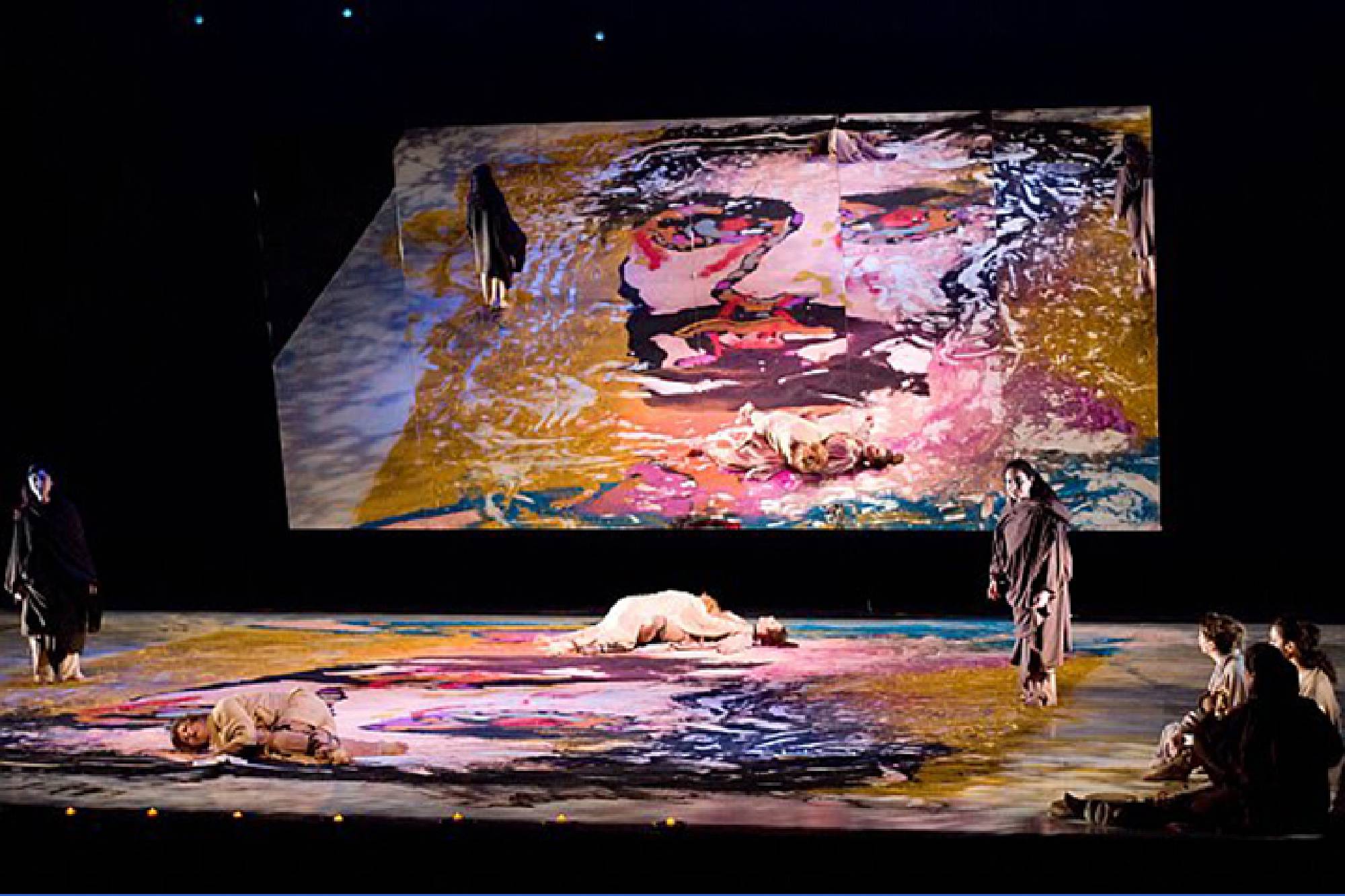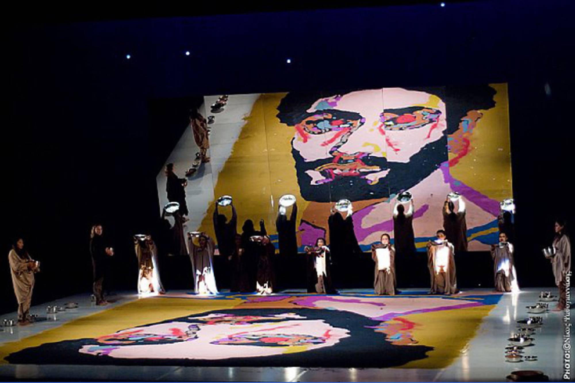 The painting, a collaboration between Ms. Rogers and a female team of 12 Greek visual artists, was recreated each night during the play’s first act by the Greek painters, cast as mourners, during the performance of the play. The painting is later systematically destroyed by the Greek actresses in the production’s second act.