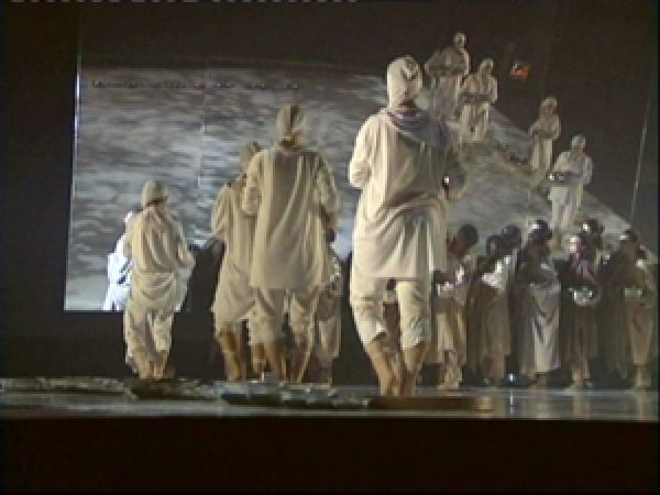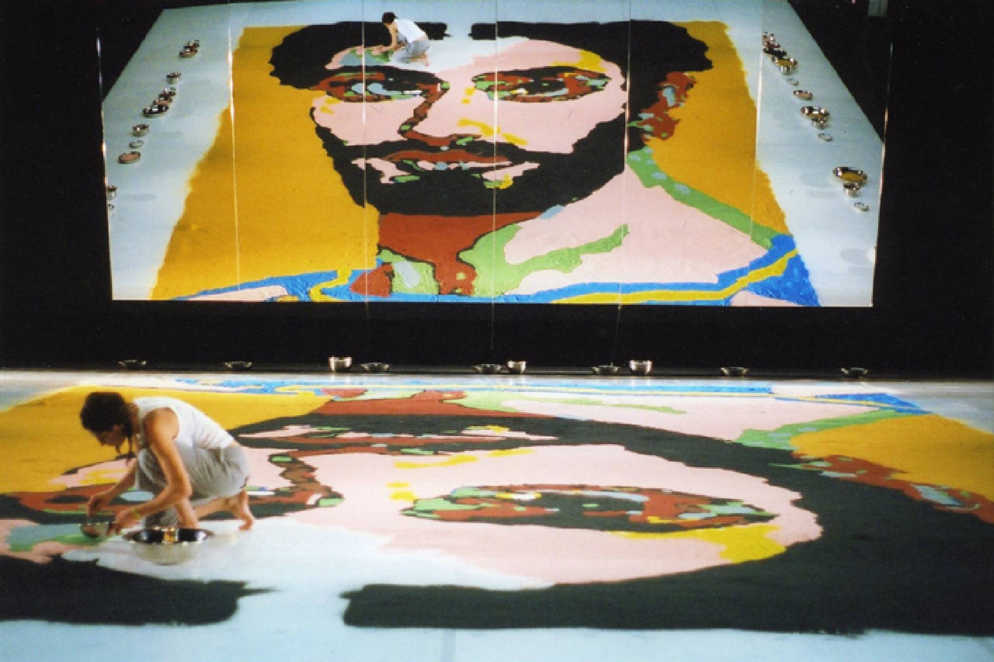 Created as a site-specific installation for a theatrical production, CHOEPHORAE – The Making of the Sand Painting documents the making of a large-scale sand portrait of Agamemnon. The play, a modern production of Aeschylus’ The Libation Bearers, (“Choephorae” in ancient Greek), is an international collaboration between a U.S and Greek company, which opened the Patras Festival in Patras, Greece, the Cultural Capital of Europe for 2006.