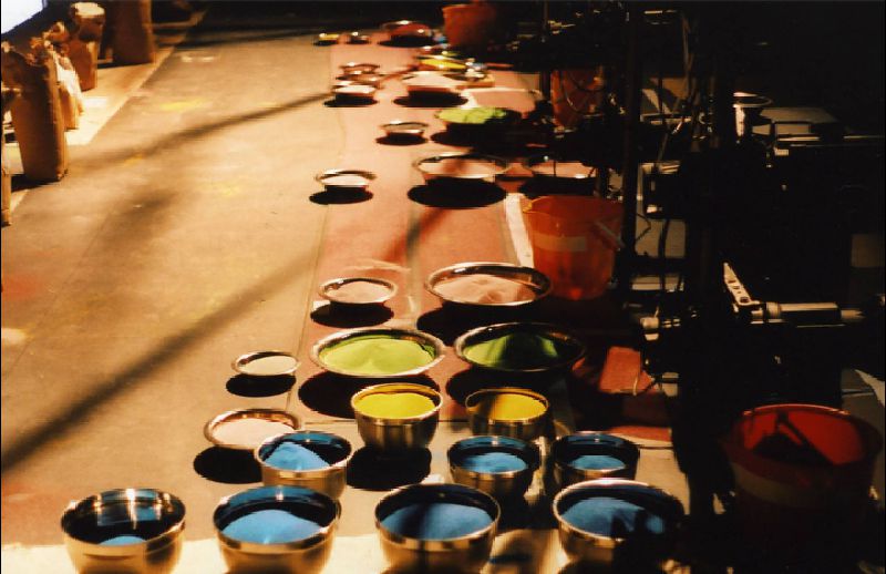The careful and deliberate process of how the painting could be completed within the actual time period of the play without pulling focus from the play’s language and performance was developed over the course of a two month rehearsal residency with the painters and actresses in Athens. This complicated process of building the sand painting had to be competed within the forty-five minutes allotted to the play’s first act & had to cover the entire stage without the painters being “seen”. Created upside down on the stage so that it could be seen rightside up by the audience, it is not until the final moments of the first act, that the painting becomes recognizable as a portrait. In addition, each section of the painting once completed, could not be walked on, thus removing another piece of play space and preserving the integrity of the image in sand until that moment of relevation when Agememnon’s spirit rises from the grave.