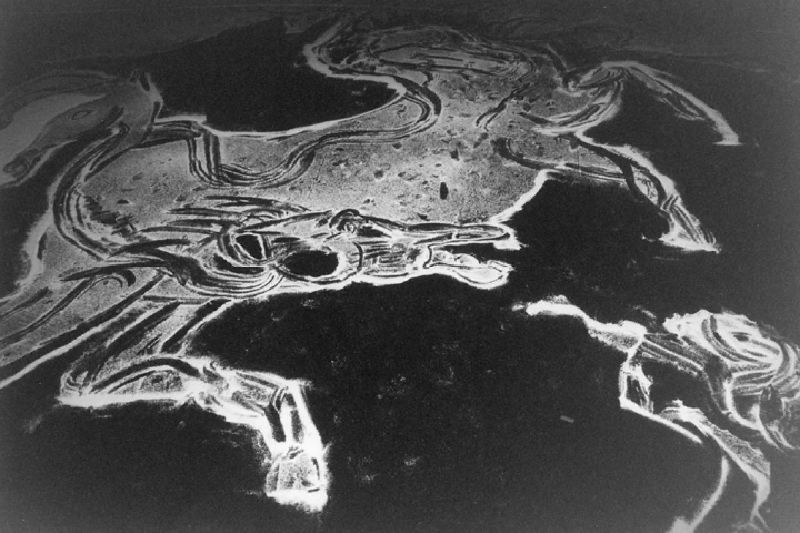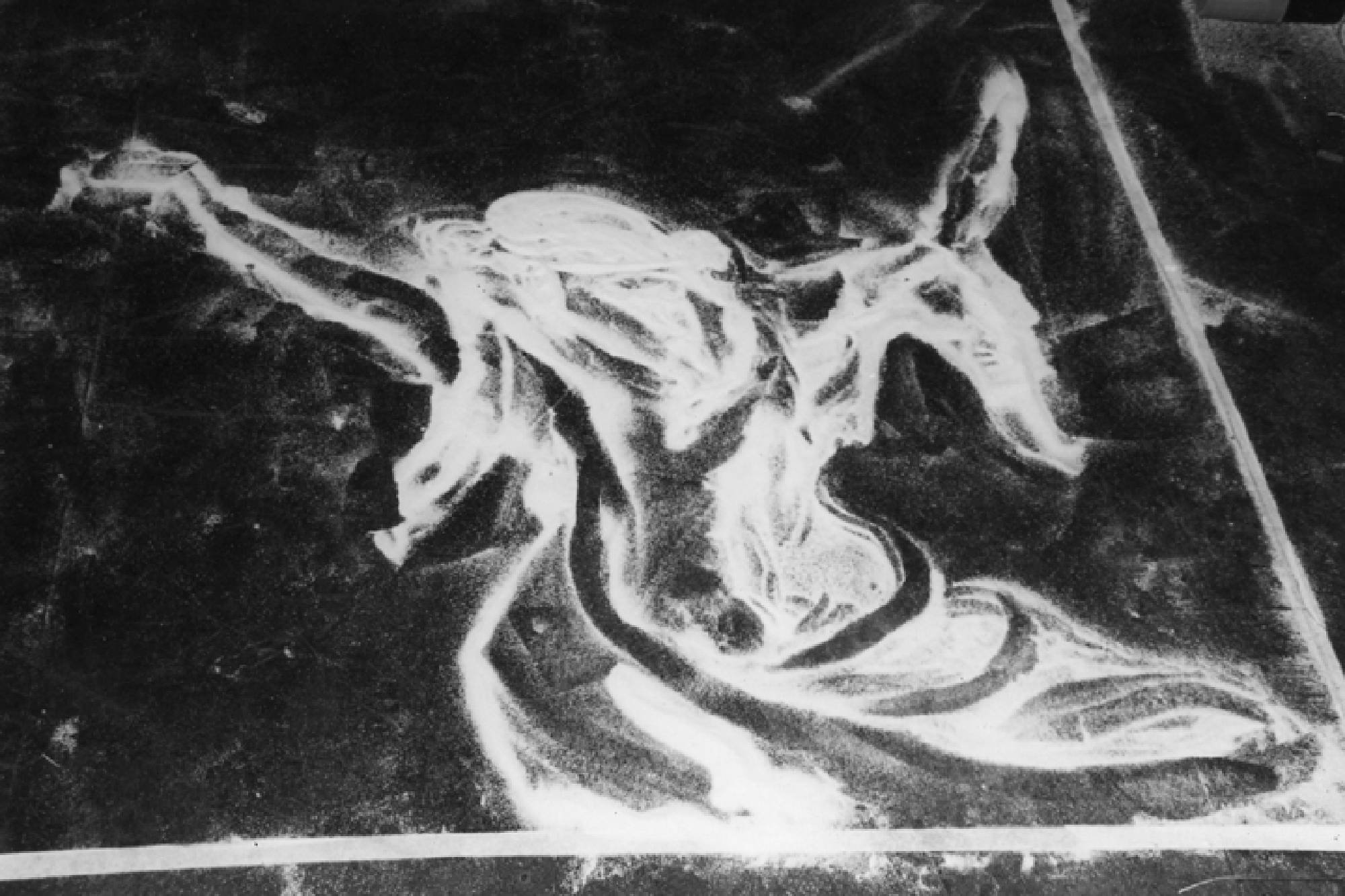 Experimental filmmaker Maya Deren, defined ritual as “an action distinguished from all others in that it seeks the realization of its purpose through the exercise of form.” Ms. Rogers’ sand paintings seek to articulate their metaphors through the method and form of their creation. Specifically found in ceremonial sand paintings, mark making in the earth here sanctifies space giving it theatrical life.