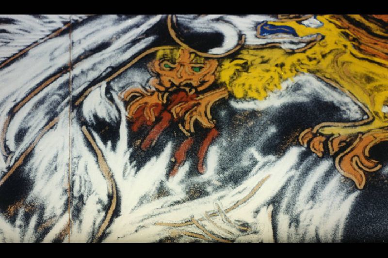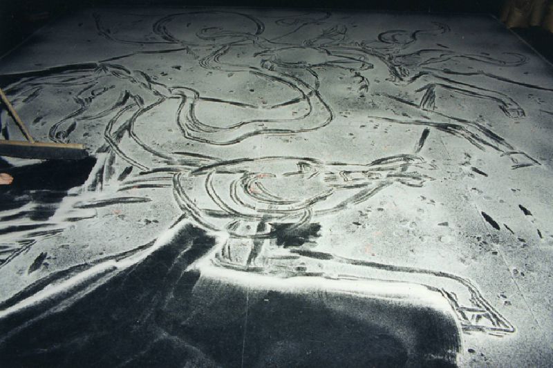 The images above show the first draft of the sand painting completed on two large masonite boards-- 8 x 8 feet in total. The last 4 images show how the painting would start as an outline in black sand, later transforming for the performance into a large-scale sand painting, 20 x 40 feet. It took 15 hours to complete each day and had to be made each day of performance prior to the show. Each sand painting would begin with Jenny scattering the stage in black sand, followed by the meticulous process of her drawing the outline in sand by hand. Color was then added in layers, giving it real depth & dimension, subtle nuances between light and dark- the chiaroscuro- or contrast of a real oil painting.